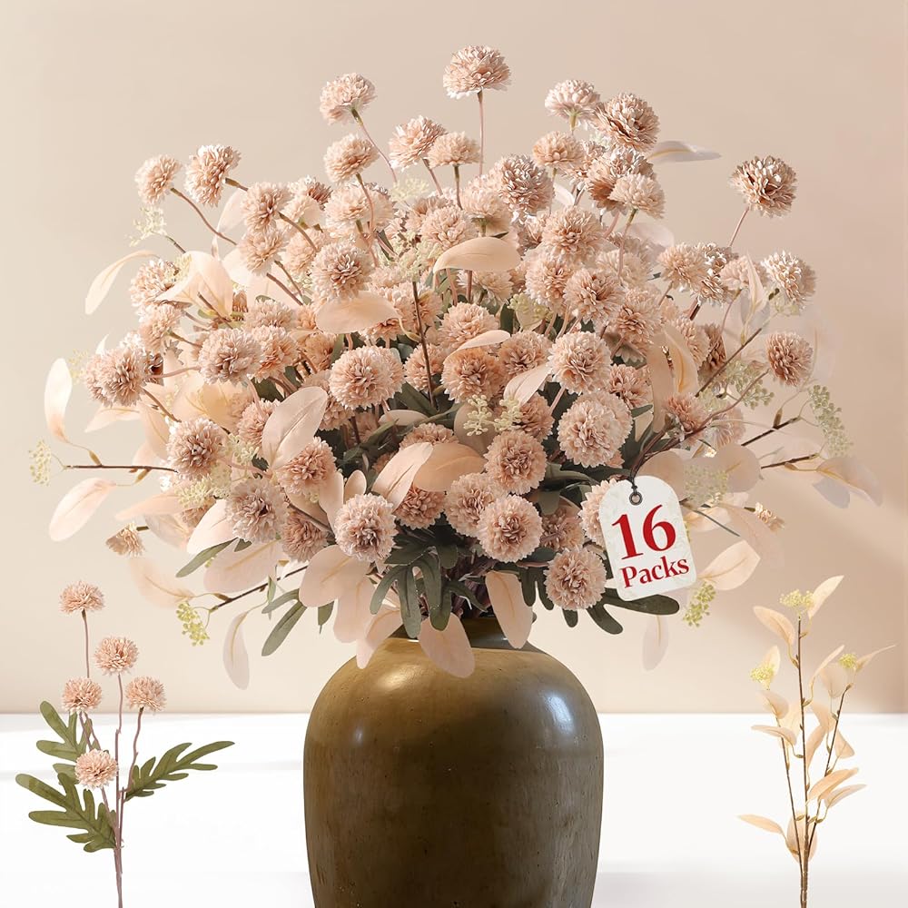【زهور صناعية حريرية أنيقة مع سيقان】16 عبوة من الزهور المزيفة، بما في ذلك 12 حزمة من سيقان أم بومبون صناعية مزينة بـ 60 كرة من الزهور البيج الرقيقة، مقترنة بـ 4 سيقان من الأوكالبتوس تتميز بـ 12 فرعًا بمظهر طبيعي - خيار مثالي لديكور المنزل الجمالي الحديث. يبلغ طول كل ساق أقحوان صناعي 52 سم (20.47 بوصة)، بينما يبلغ طول سيقان الأوكالبتوس البيج 48 سم (18.9 بوصة)، مما يوفر نسبة مثالية لمعظم المزهريات القياسية وإعدادات القطع المركزية للطاولة. (بدون مزهرية)