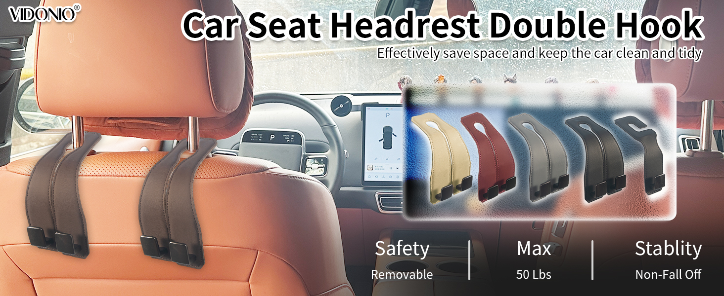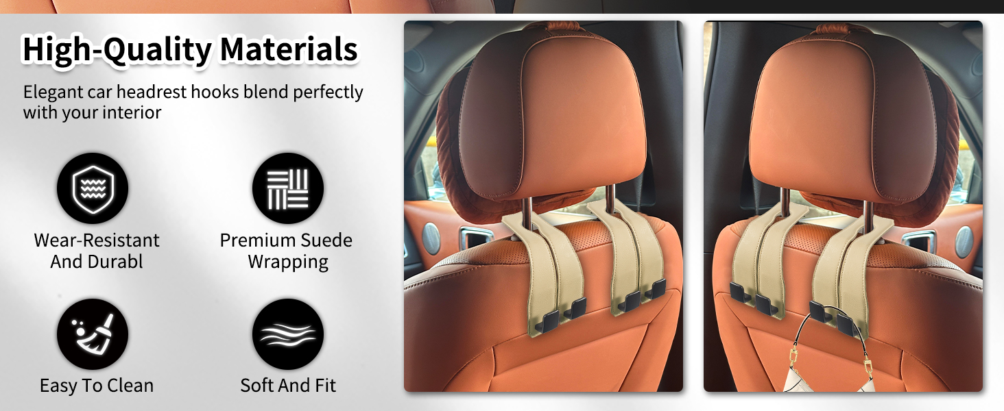 قم بحماية مقاعد سيارتك: مصنوعة من الجلد الناعم والممتاز، تضمن خطافات مسند الرأس الخاصة بنا أن يكون سطح مقعدك خاليًا من الخدوش ويظل سليمًا. التصميم المخفي الأنيق لا يعزز السلامة فحسب، بل يضيف أيضًا لمسة من الرقي، ويتجنب الضرر الذي قد يحدث بسبب الخطافات البلاستيكية الصلبة التقليدية.