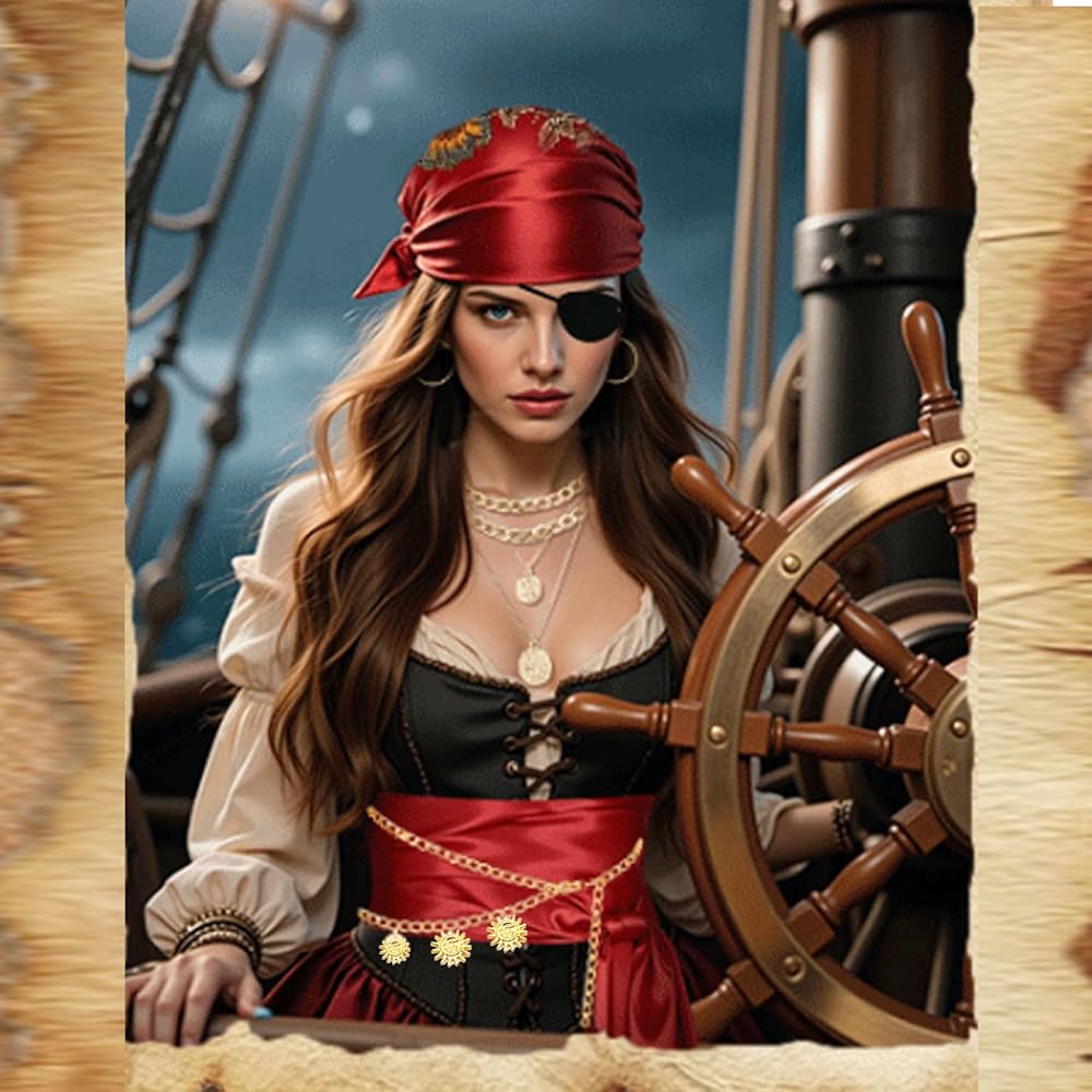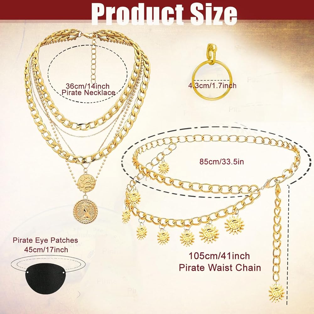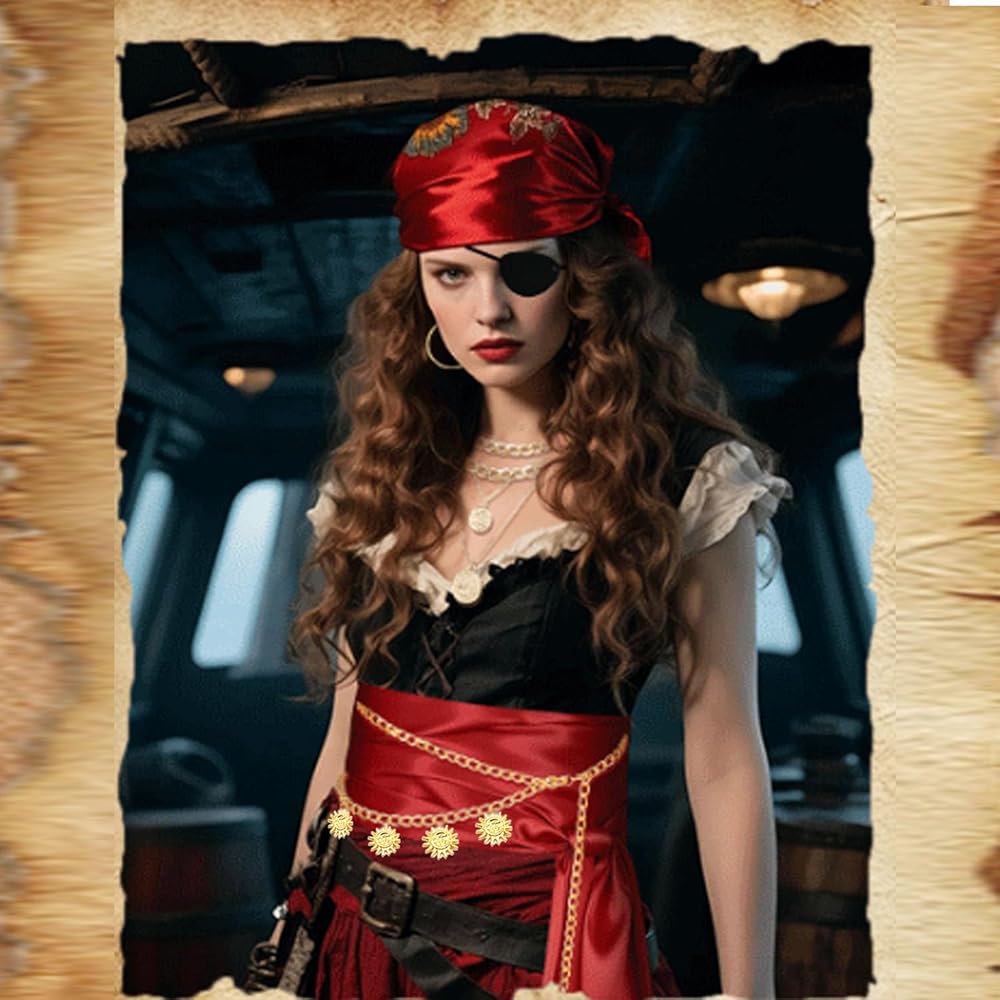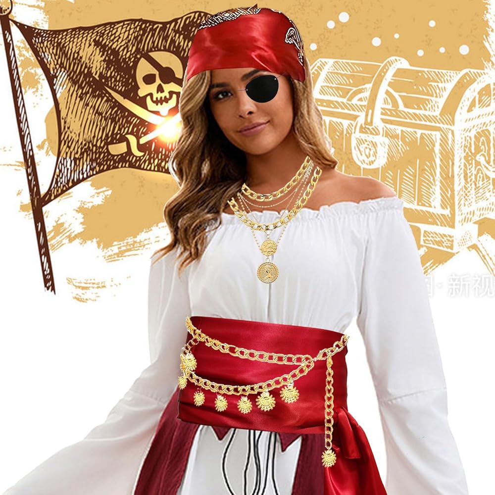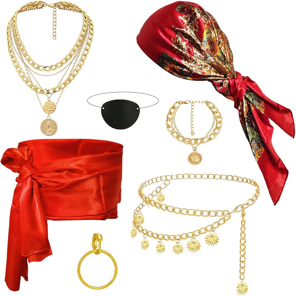 مجموعة إكسسوارات القرصان: مجموعة إكسسوارات زي القرصان تتضمن 1 × وشاح رأس قرصان (لون أحمر خمري)، 1 × سلسلة خصر (لون ذهبي)، 1 × وشاح أحمر (لون أحمر)، 1 × قلادة (لون ذهبي)، 1 × رقعة عين قرصان (لون أسود)، 1 × قرط (لون ذهبي).