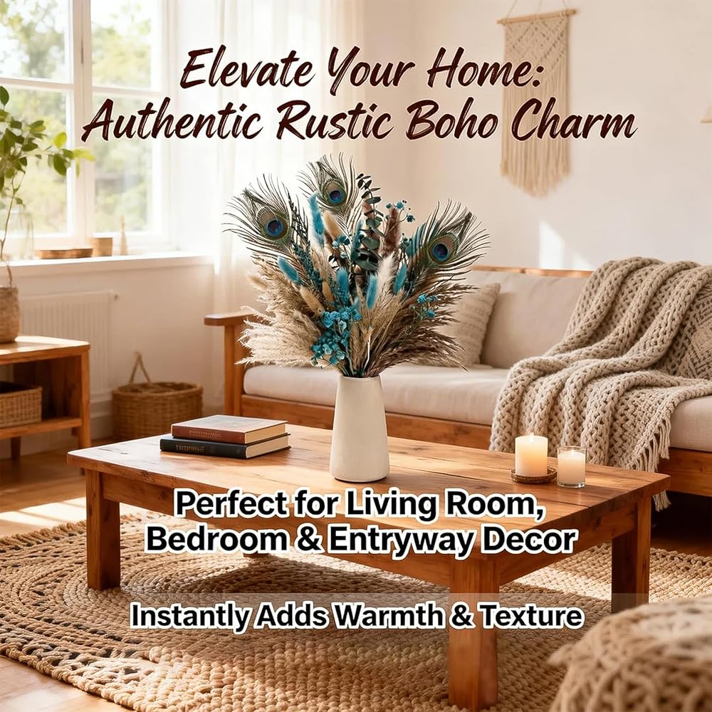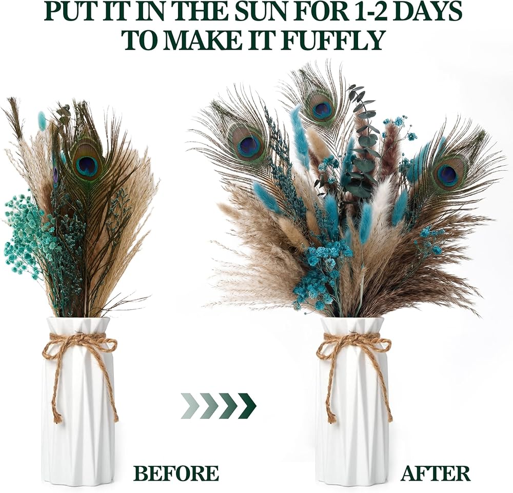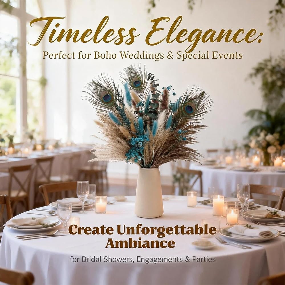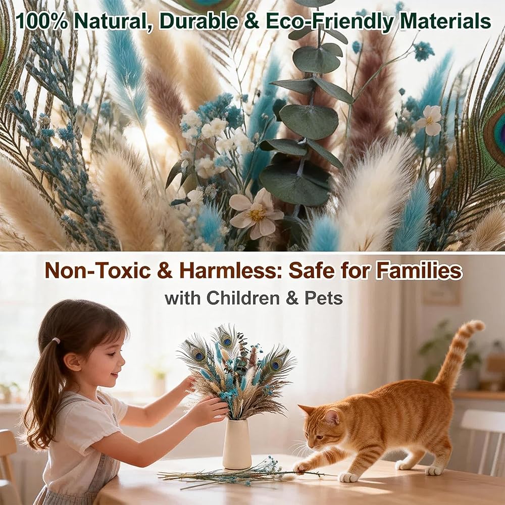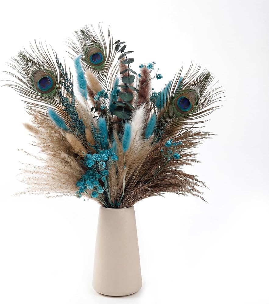 - طراز بوهو ريفي، مثالي لسيناريوهات متعددة: المزيج الفريد من عشب ذيل الأرنب والأوكالبتوس وأنفاس الطفل وريش الطاووس والقصب يخلق جوًا ريفيًا قويًا. إنه مثالي لديكور المنزل، وديكورات الخريف، وديكور الزفاف، كما أنه بمثابة هدية مدروسة للأصدقاء أو العائلة أو الزملاء في أعياد الميلاد أو الانتقال لمنزل جديد أو العطلات.