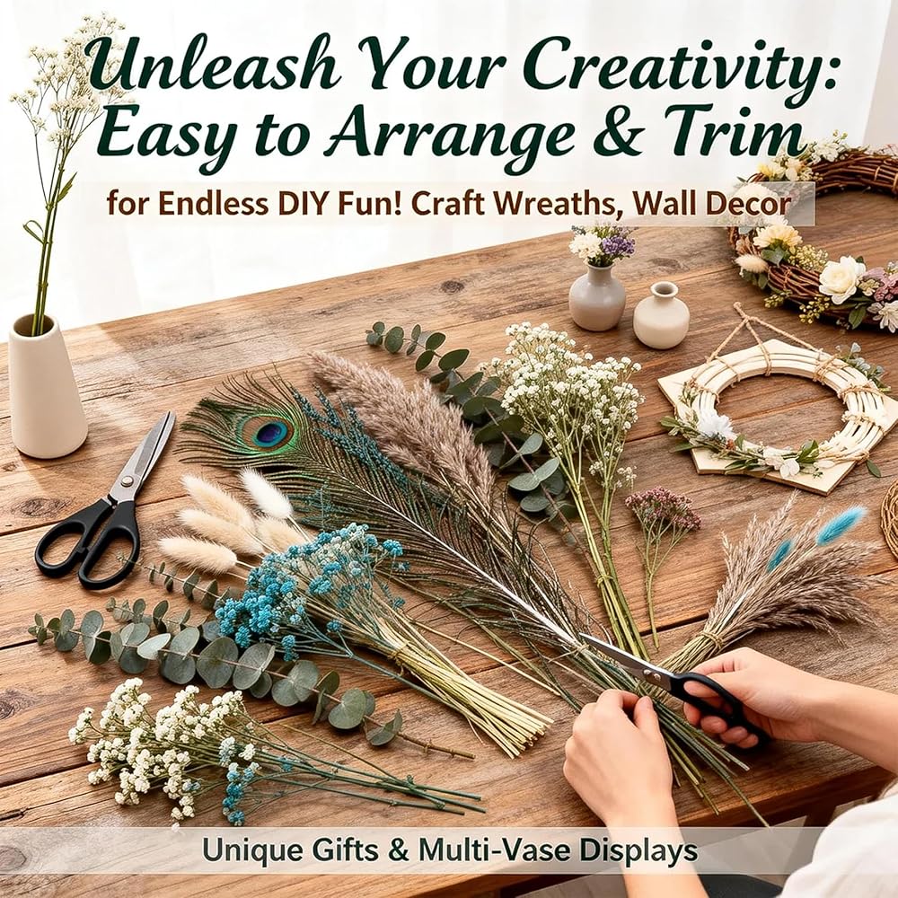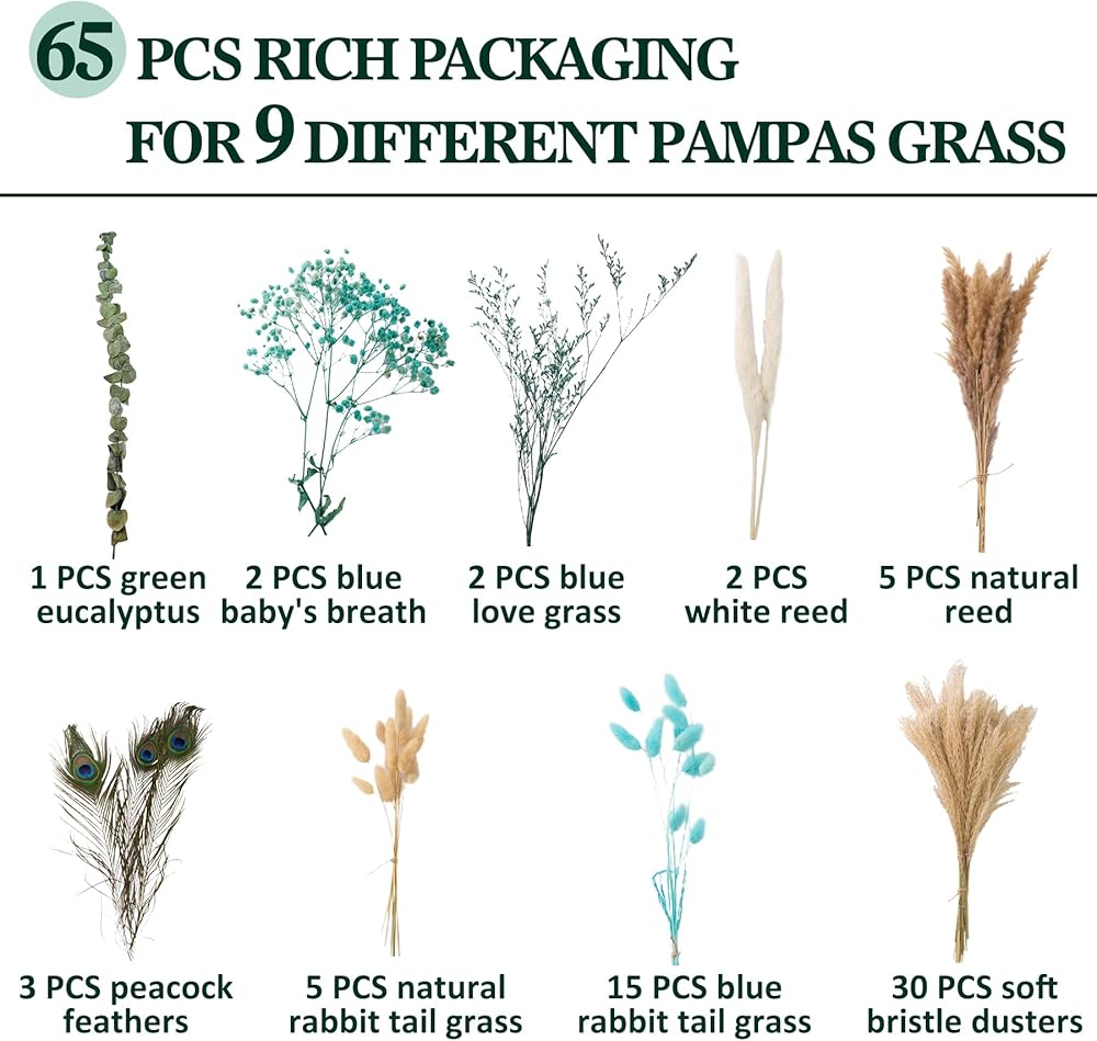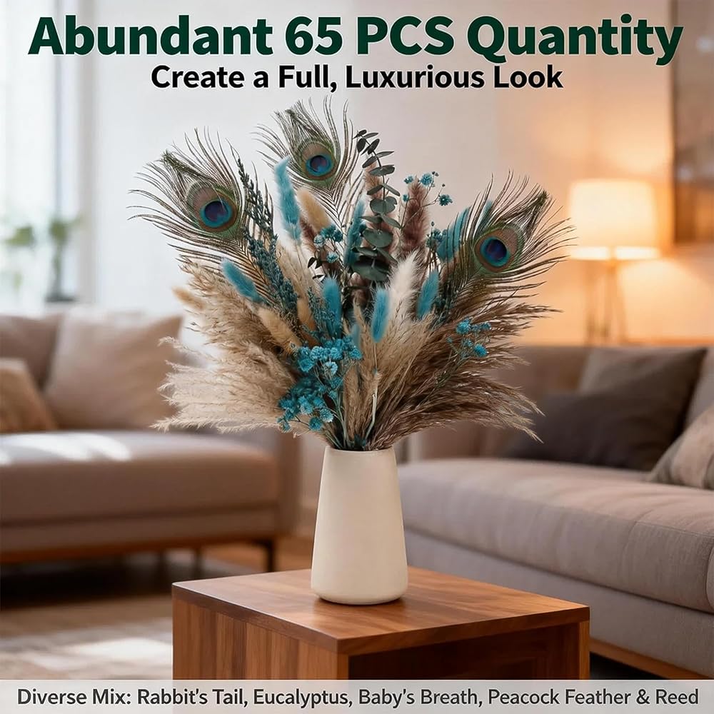 - كمية وفيرة من 65 قطعة للديكور متعدد الاستخدامات: تأتي باقة الزهور المجففة هذه مع 65 قطعة كبيرة، بما في ذلك عشب ذيل الأرنب والأوكالبتوس وأنفاس الطفل وريش الطاووس والقصب. تتيح لك الكمية الكافية إنشاء أنماط ديكور متنوعة - سواء كانت قطعة مركزية كاملة للطاولة، أو ترتيبًا رقيقًا للحائط، أو مجموعة من المزهريات بأحجام مختلفة لملء مساحات متعددة في منزلك.