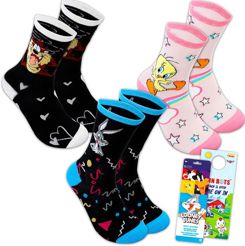 Looney Tunes Socks Set - Bundle with 3 Pairs of Crew Length Socks Featuring Bugs Bunny, Tweety Bird, More Plus Stickers | Looney Tunes Apparel for Women. This Looney Tunes socks set includes 3 pairs of crew length socks featuring artwork of favorite Looney Tunes characters including Bugs Bunny, Tweety Bird, and Daffy Duck. Perfect to give to any Looney Tunes fan, these Looney Tunes socks are great to include as a stocking stuffer or Christmas set. These Looney Tunes socks are made of 98% polyester and 2% spandex. Looney Tunes socks are sure to be long-lasting and be comfortable for many uses. Officially licensed Looney Tunes socks are great for men and women alike. This Looney Tunes socks set also comes with Looney Tunes stickers and a Beach Kids Barn Bots door hanger.
