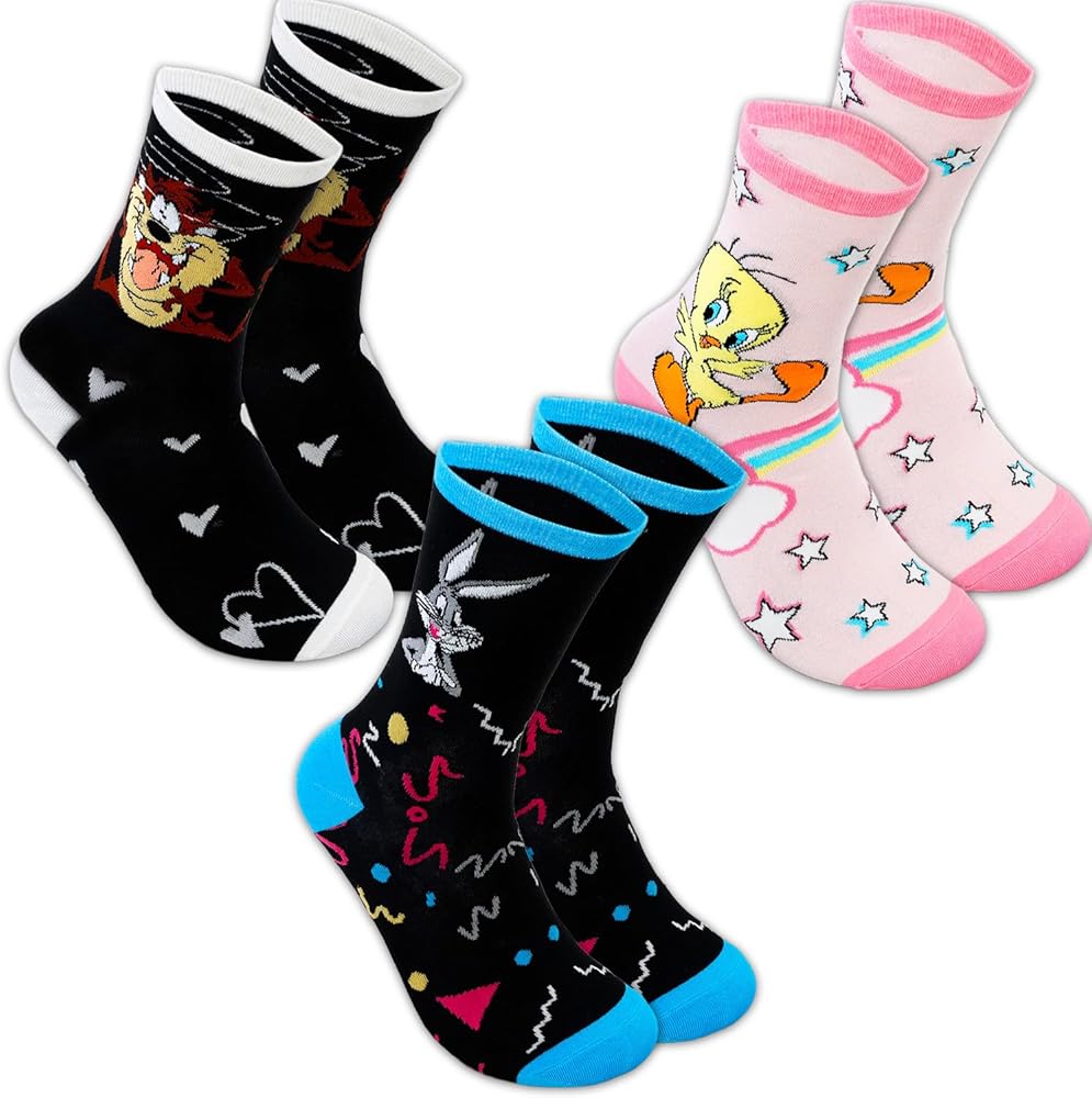 Looney Tunes Socks Set - Bundle with 3 Pairs of Crew Length Socks Featuring Bugs Bunny, Tweety Bird, More Plus Stickers | Looney Tunes Apparel for Women.