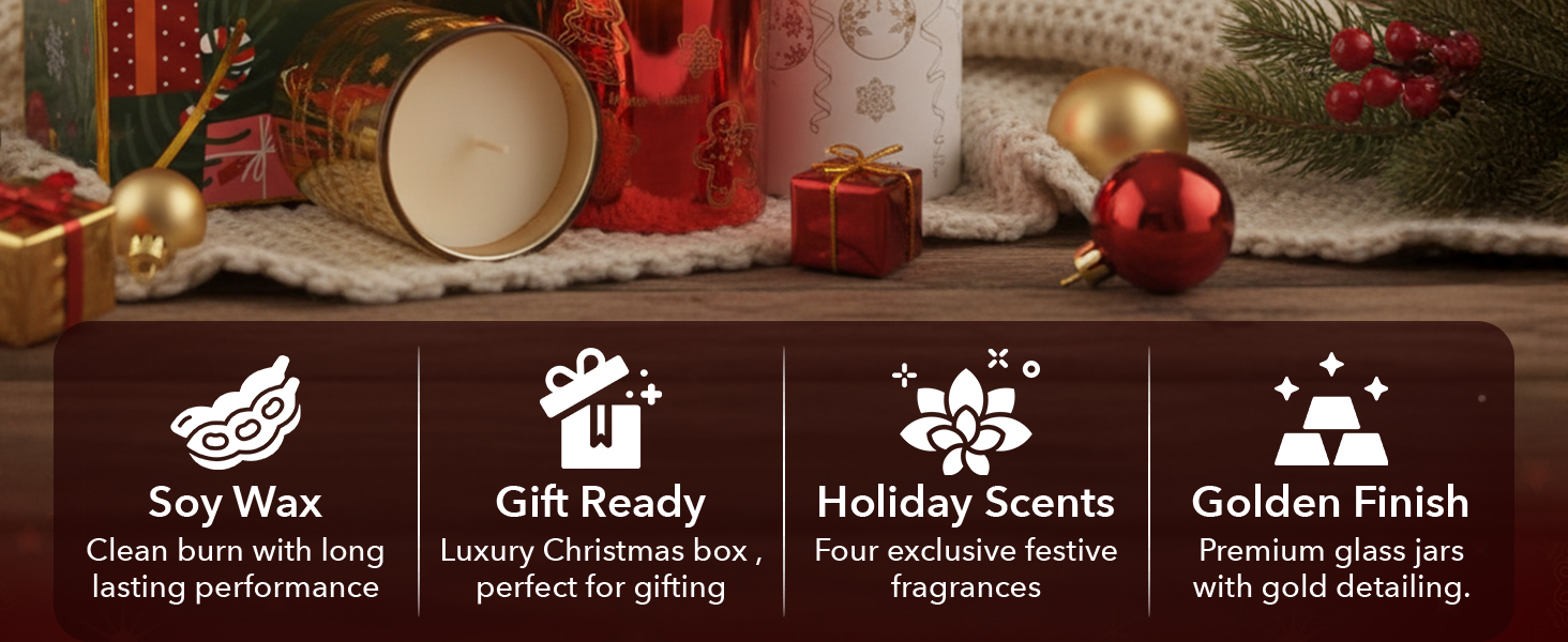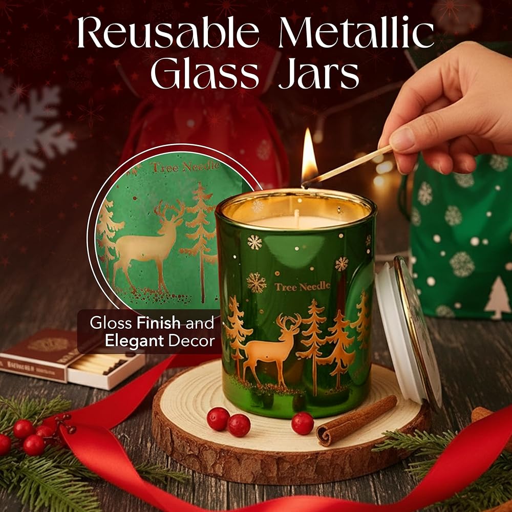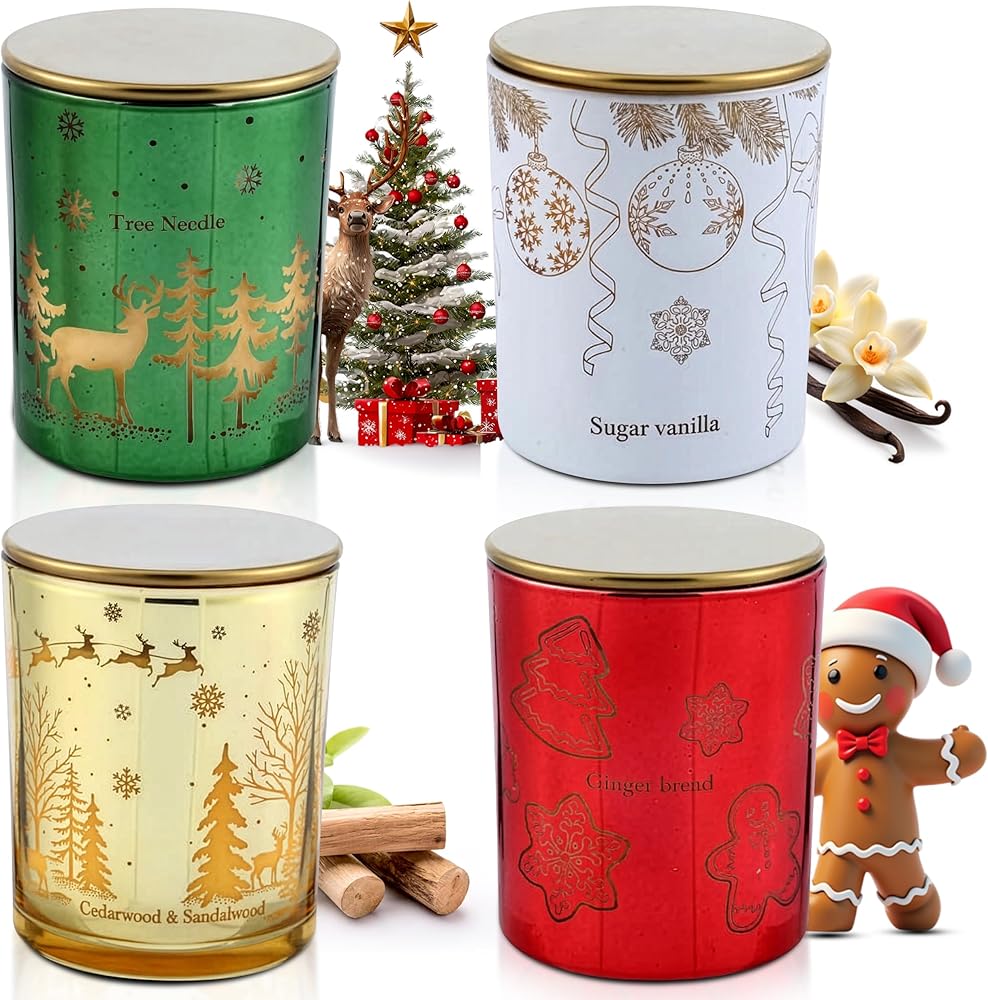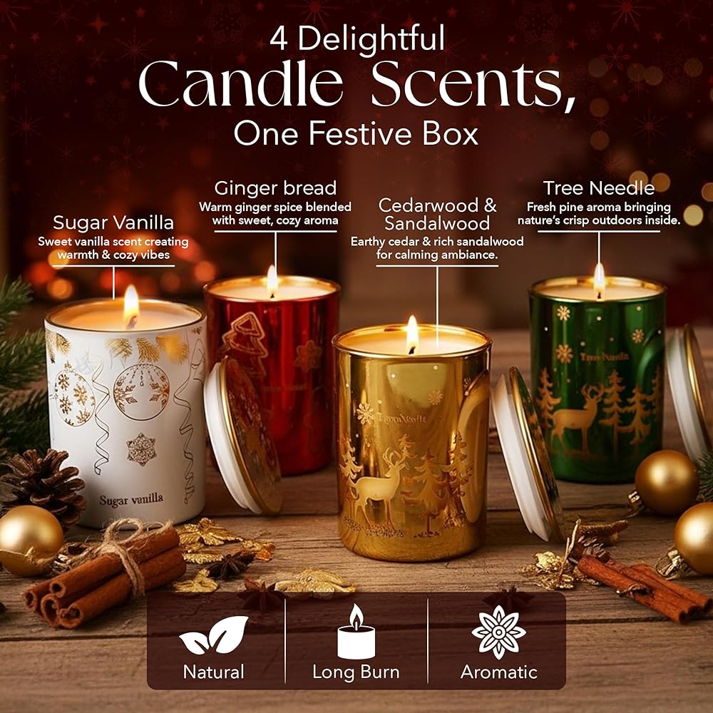 مجموعة هدايا شموع عيد الميلاد من Majestic Zen لديكور المنزل - شموع معطرة مع خشب الأرز والفانيليا والسكر وإبرة الشجرة - مجموعة هدايا شموع عيد الميلاد للنساء والرجال - عطر منزلي احتفالي - 4 عبوات