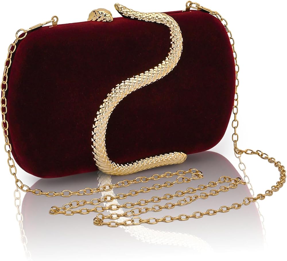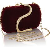 محفظة باللون الأحمر الخمري مع لمسات الثعبان: تتميز هذه المحفظة ذات اللون الأحمر الخمري بلمسات معدنية أنيقة على شكل ثعبان تلتف برشاقة على كل من الأمام والخلف، مما يضيف لمسة جريئة وفنية.