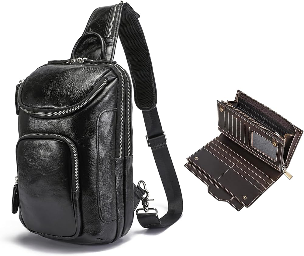 LANNSYNE Vintage Full Grain Leather Sling Bag Crossbody Chest Daypack And Grain Leather Travel Passport Long Wallet for Men/Women RFID Blocking