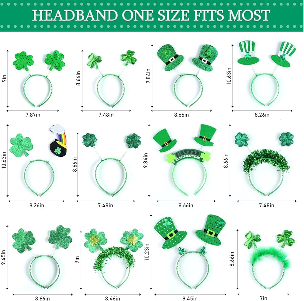 ☘️【تشمل العبوة】كميات كافية وأنماط مختلفة، سوف تحصل على 12 قطعة من عصابات رأس نبات النفل مع 12 نمطًا مختلفًا؛ الكمية كافية، مما يسمح لك بالاستخدام والتغيير والمشاركة في حفلة عيد القديس باتريك الخاصة بك.