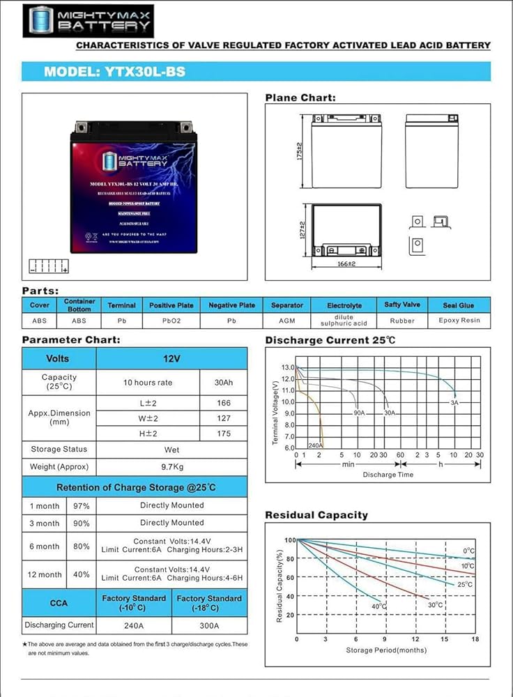 • YTX30L-BS عبارة عن بطارية حمض الرصاص المختومة (SLA) بقدرة 12 فولت 30 أمبير في الساعة 385 أمبير (CCA)