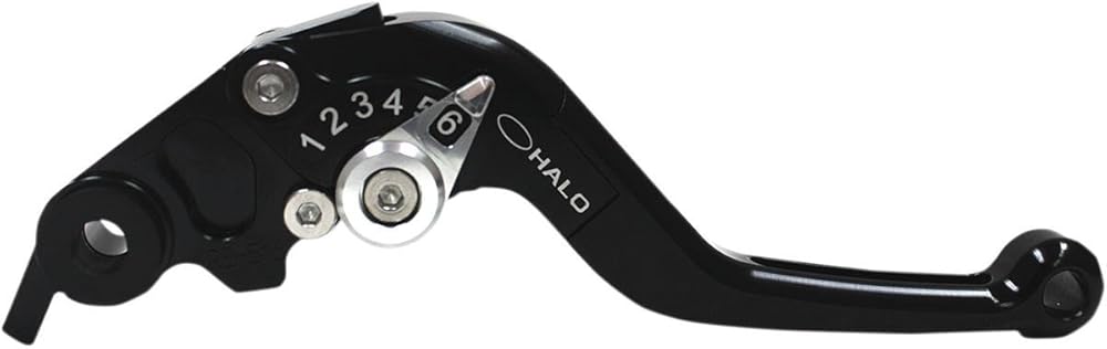 Aero slot to reduce wind drag. 6061 T-6 CNC machined construction. Folds 90 degrees to eliminate breakage. Cam roller rides on a roller bearing. Available for current sports bike. Black anodized with a silver switch. Adjustable on the go from 0-15deg. with a six-click lever.