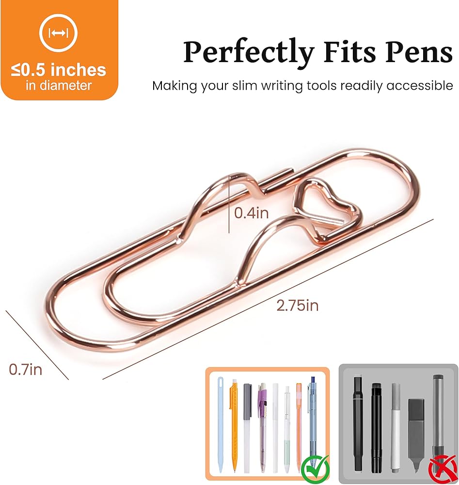 الأبعاد: يبلغ مقاس مشبك القلم هذا 0.7 × 2.6 بوصة ويناسب أقلام الحبر الجاف وأقلام النافورة وأدوات الكتابة الأخرى التي يقل قطرها عن 0.5 بوصة. فهو يحمل أنواعًا مختلفة من الأقلام بشكل آمن لتجربة كتابة خالية من القلق