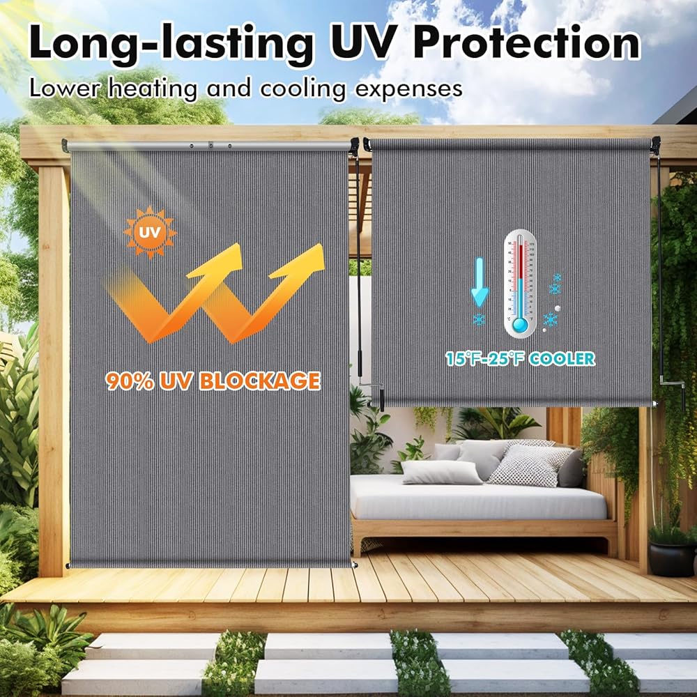 90% UV PROTECTION: Durable 220 GSM HDPE fabric construction ensures exterior roller shade blocks 90% of harmful UV rays, protecting your family and outdoor furniture. It reduces glare while retaining natural light, for a healthier, more private outdoor area.