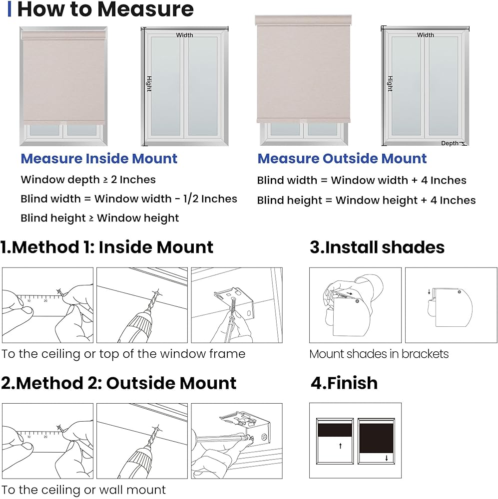 • نصيحة احترافية لمقاس فريق ما بعد البيع: مشبك التثبيت الداخلي مطروحًا منه عرض 1/2 بوصة، على سبيل المثال، حجم النافذة هو 34 بوصة عرض × 64 بوصة ارتفاع، وحجم الستائر الدوارة هو 33 1/2 بوصة عرض × 64 بوصة ارتفاع، بحيث يمكن وضع الستائر الدوارة بدقة في إطار النافذة، والتركيب الخارجي للعرض الموصى به +4 بوصات وارتفاع 4 بوصات، وحجم المنتج هو 38 بوصة عرض × 68 بوصة ارتفاع، بحيث الستائر الدوارة يمكن أن تكون تغطية أفضل للنافذة!