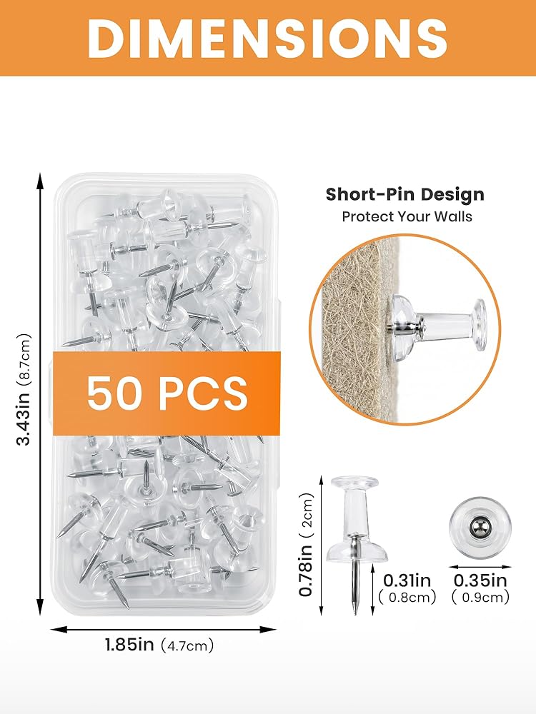 【حجم مصمم خصيصًا】 يبلغ طول دبابيسنا 0.78 بوصة مع رأس فولاذي 0.31 بوصة. This shorter head design prevents piercing through bulletin boards or cork boards, effectively avoiding wall damage caused by common 0.43-inch steel head pins on the market.