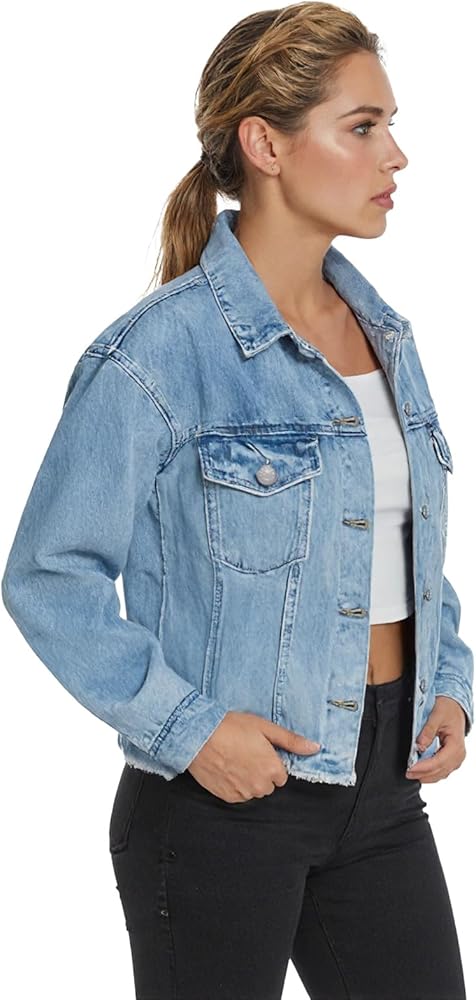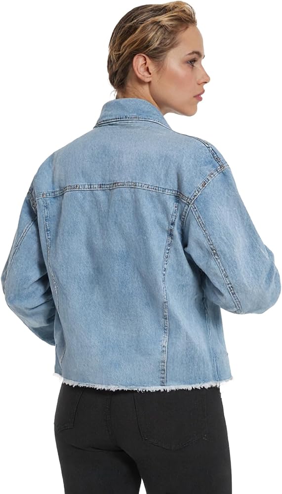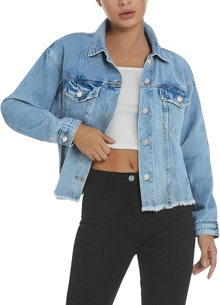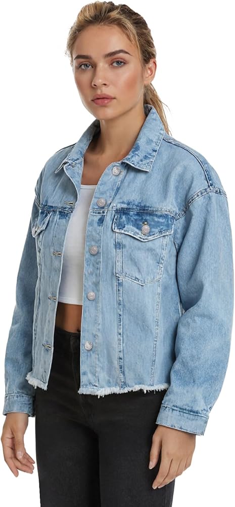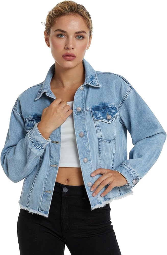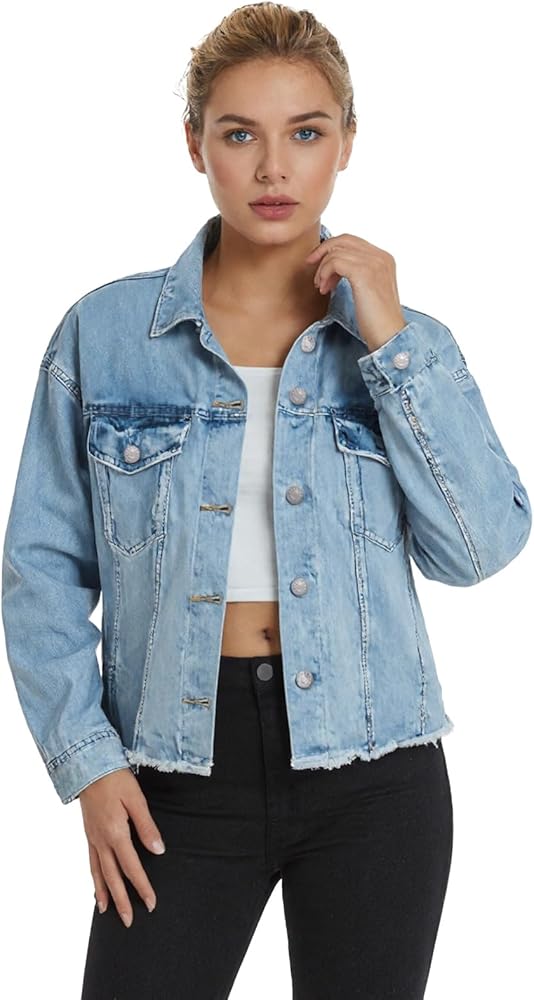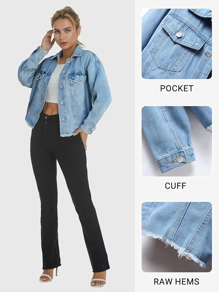 تنوع الطراز: هذا الجاكيت النسائي من الدنيم ذو الحواف الخام يضيف حافة. طبقة فوق الفساتين أو التيشيرتات - مثالية لأزياء الشارع أو المواعيد أو إطلالات التخرج!