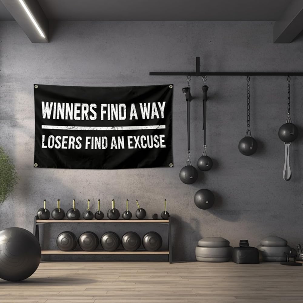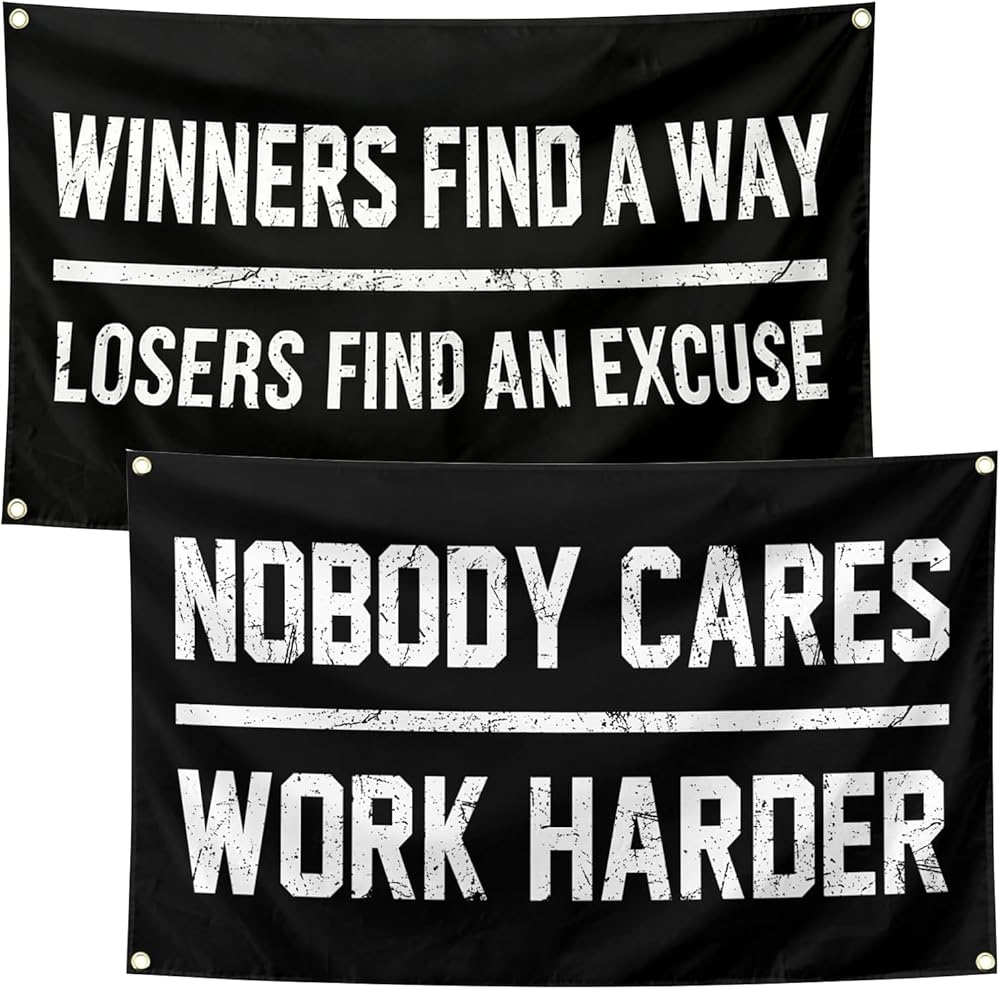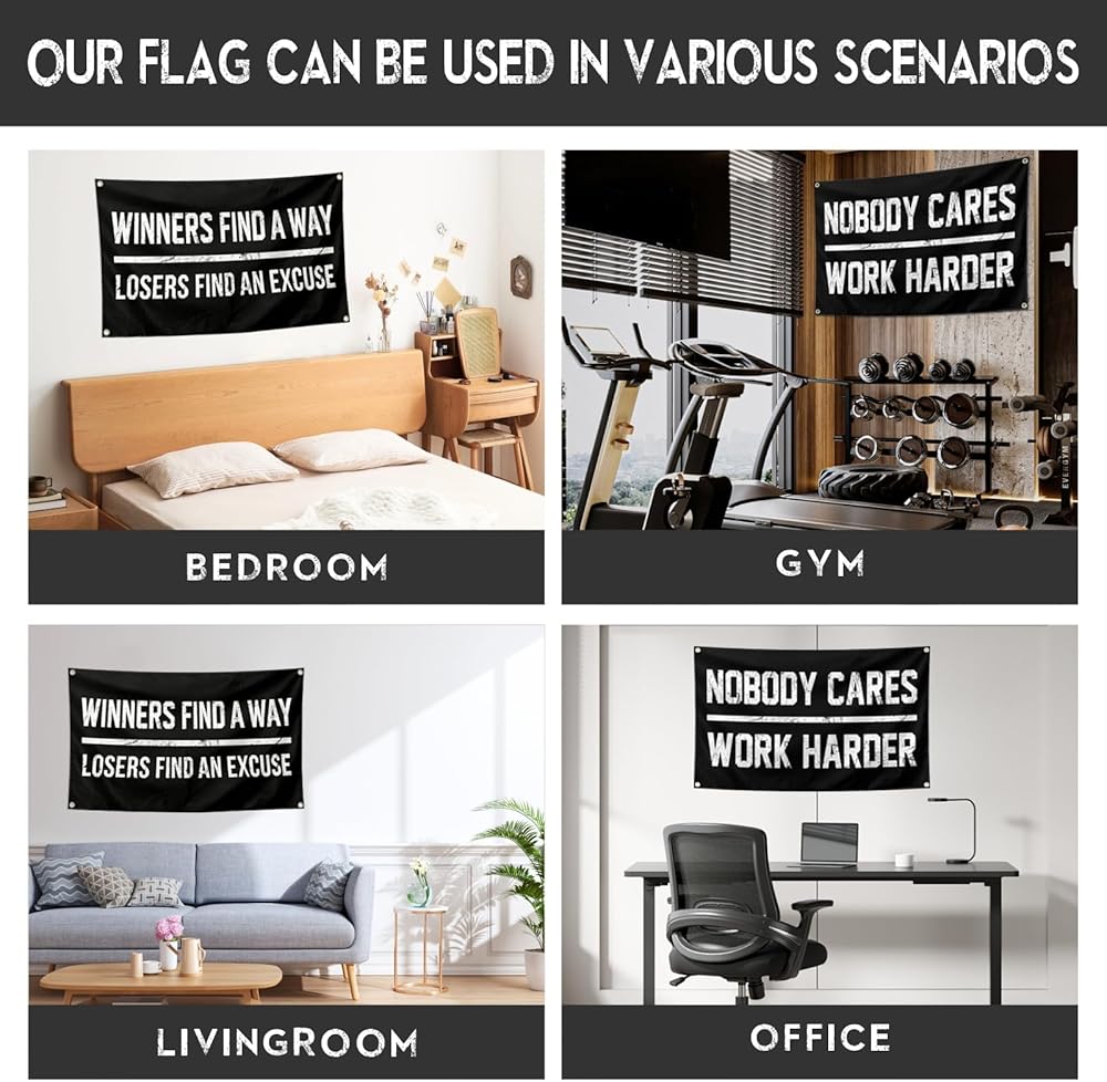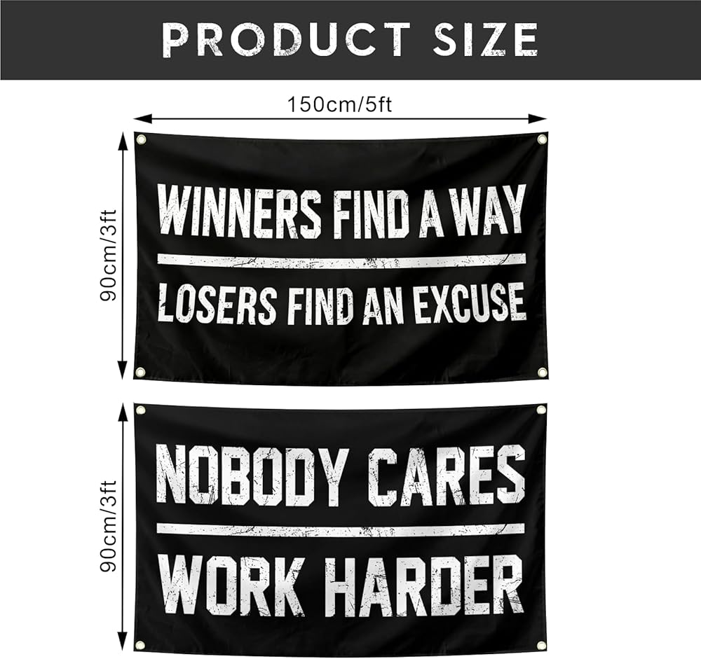 【Vibrant Design & Message】Featuring two powerful slogans — “Winners Find A Way. Losers Find An Excuse.” and “Nobody Cares Work Harder” — each banner is printed with sharp, fade-resistant graphics. The clean finish and bold typography create striking gym decor that motivates daily.