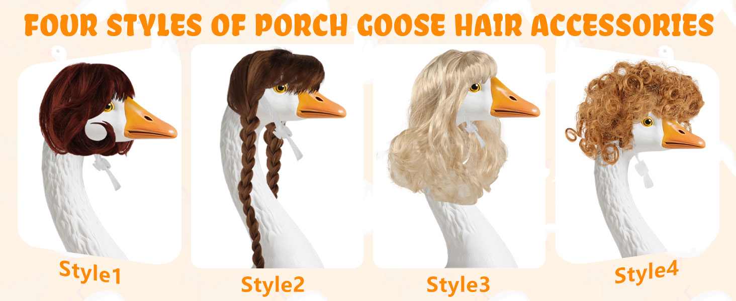 4 أنماط وألوان - تتضمن مجموعة الشعر المستعار على شكل أوزة الشرفة 4 أنماط مصممة بشكل جميل، مما يوفر إمكانيات لا حصر لها للمزج والمطابقة. سواء كنت تفضلين الضفائر الكلاسيكية، أو التجعيدات النطاطة، أو المظهر المرح، فإن هذه الباروكات تتيح لك تخصيص تمثال الإوز الخاص بك لأي موسم أو مناسبة.