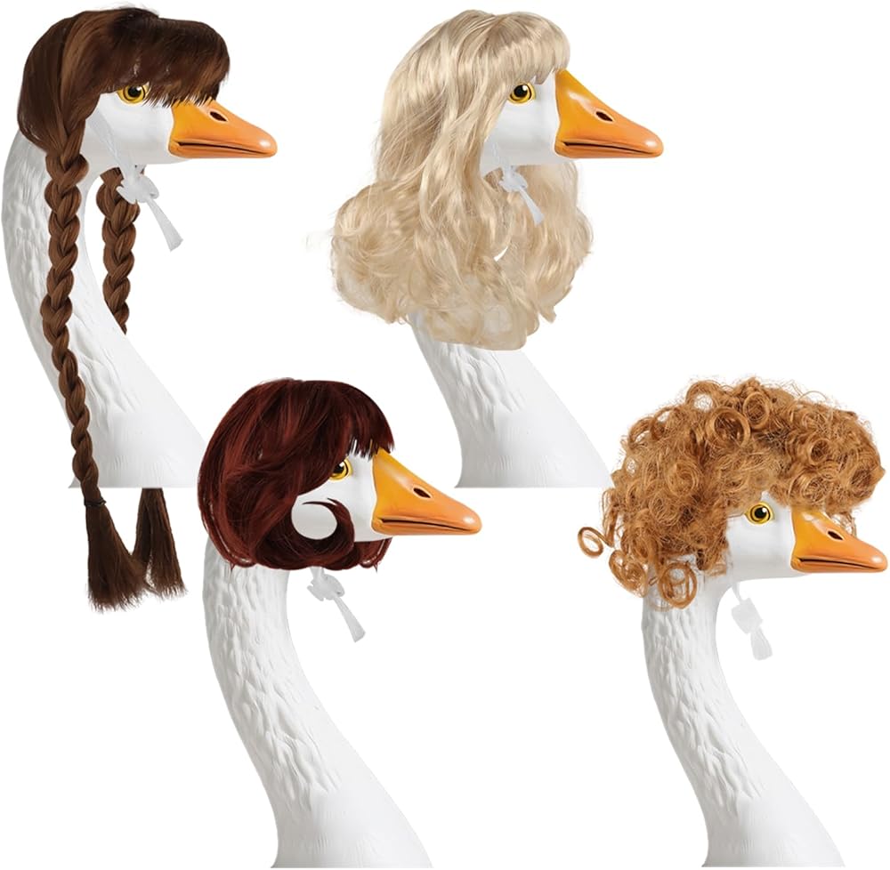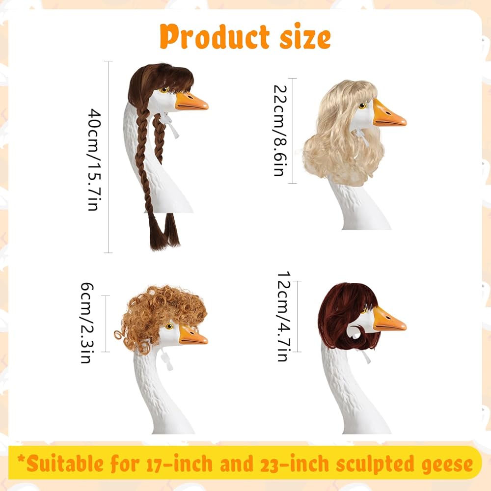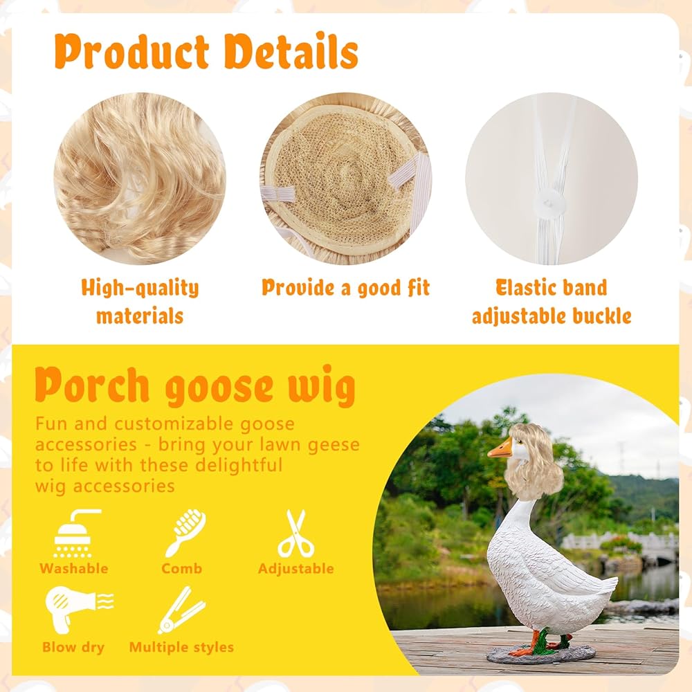 ديكور الإوزة المبتكر - أضف لمسة شخصية إلى حديقتك أو الفناء الخاص بك مع هذه الإكسسوارات الرائعة من شعر الإوز المستعار! مناسبة لتزيين تمثال الإوز الخاص بك في الهواء الطلق، تتيح لك هذه الباروكات تجربة تسريحات شعر مختلفة - مربوطة أو فضفاضة أو حتى على شكل DIY - مما يجعل ديكور منزلك فريدًا من نوعه حقًا.
