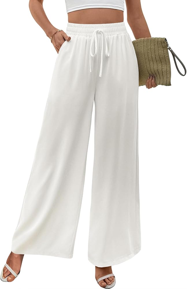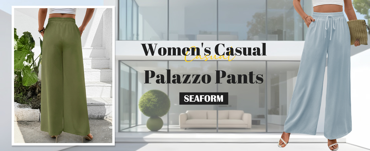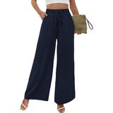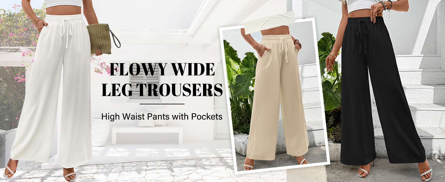 - البنطلون مصنوع من قماش ناعم ومريح. يتميز بحزام خصر مطاطي برباط وتصميم بأرجل واسعة، وهو يناسب مجموعة متنوعة من أنواع الجسم.