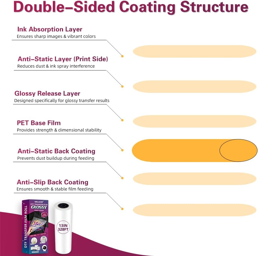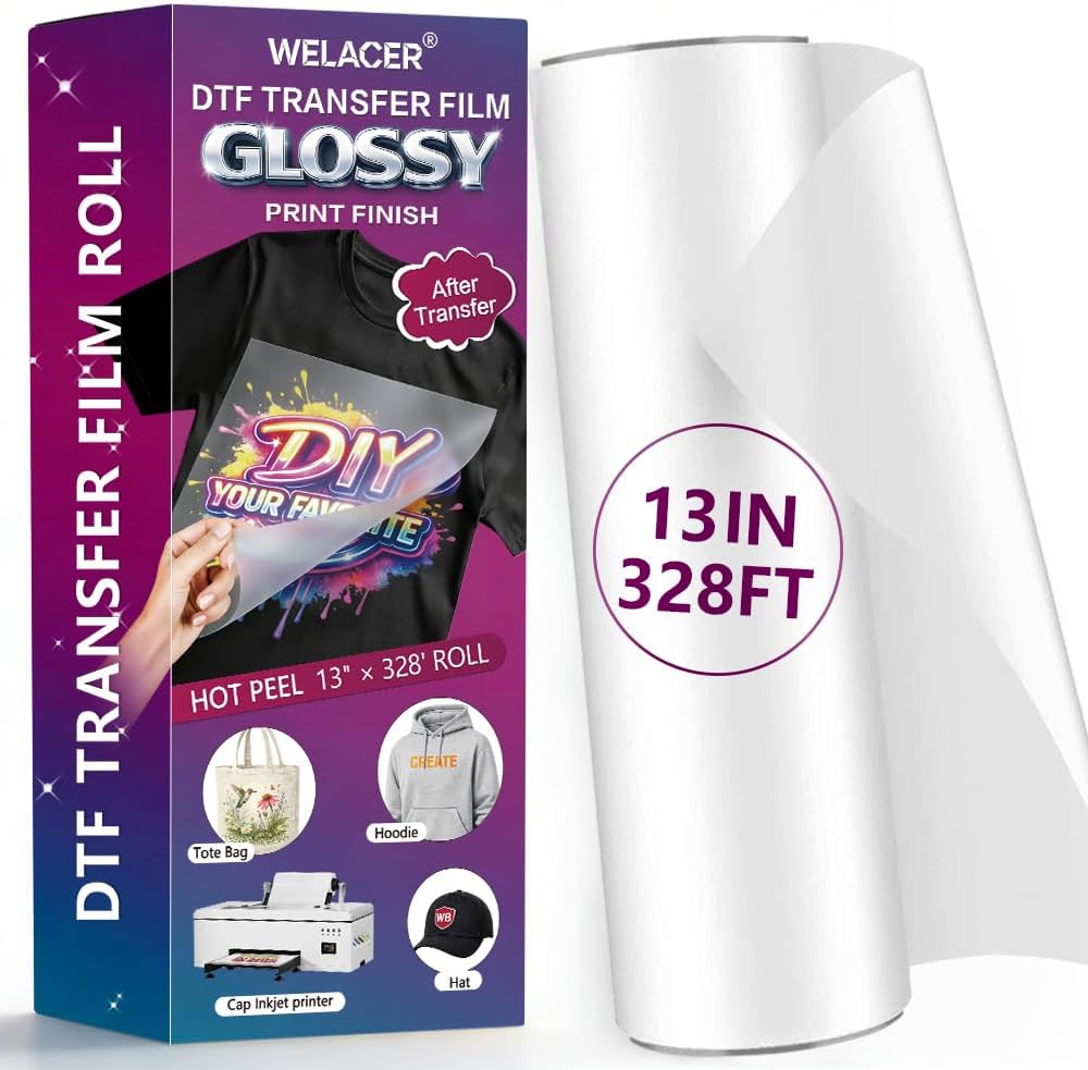لفة فيلم نقل DTF، مقاس 13 بوصة × 328 قدمًا - لمسة نهائية لامعة للنقل، فيلم PET مطلي على الوجهين، متوافق مع التقشير الساخن والبارد