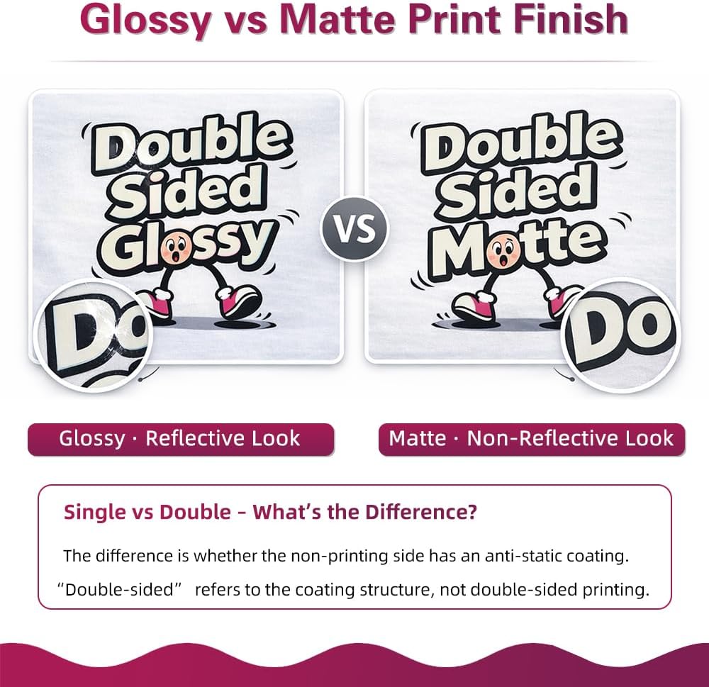 • طلاء مضاد للكهرباء الساكنة وجانب واحد قابل للطباعة. معالجة مضادة للكهرباء الساكنة على كلا الجانبين تقلل من تراكم الكهرباء الساكنة؛ يحتوي الجانب الخلفي على طلاء مضاد للكهرباء الساكنة من أجل تغذية أكثر ثباتًا واهتزاز مسحوق أكثر نظافة. جانب واحد فقط قابل للطباعة، ويكون المظهر غير اللامع أو المتجمد قبل النقل أمرًا طبيعيًا.