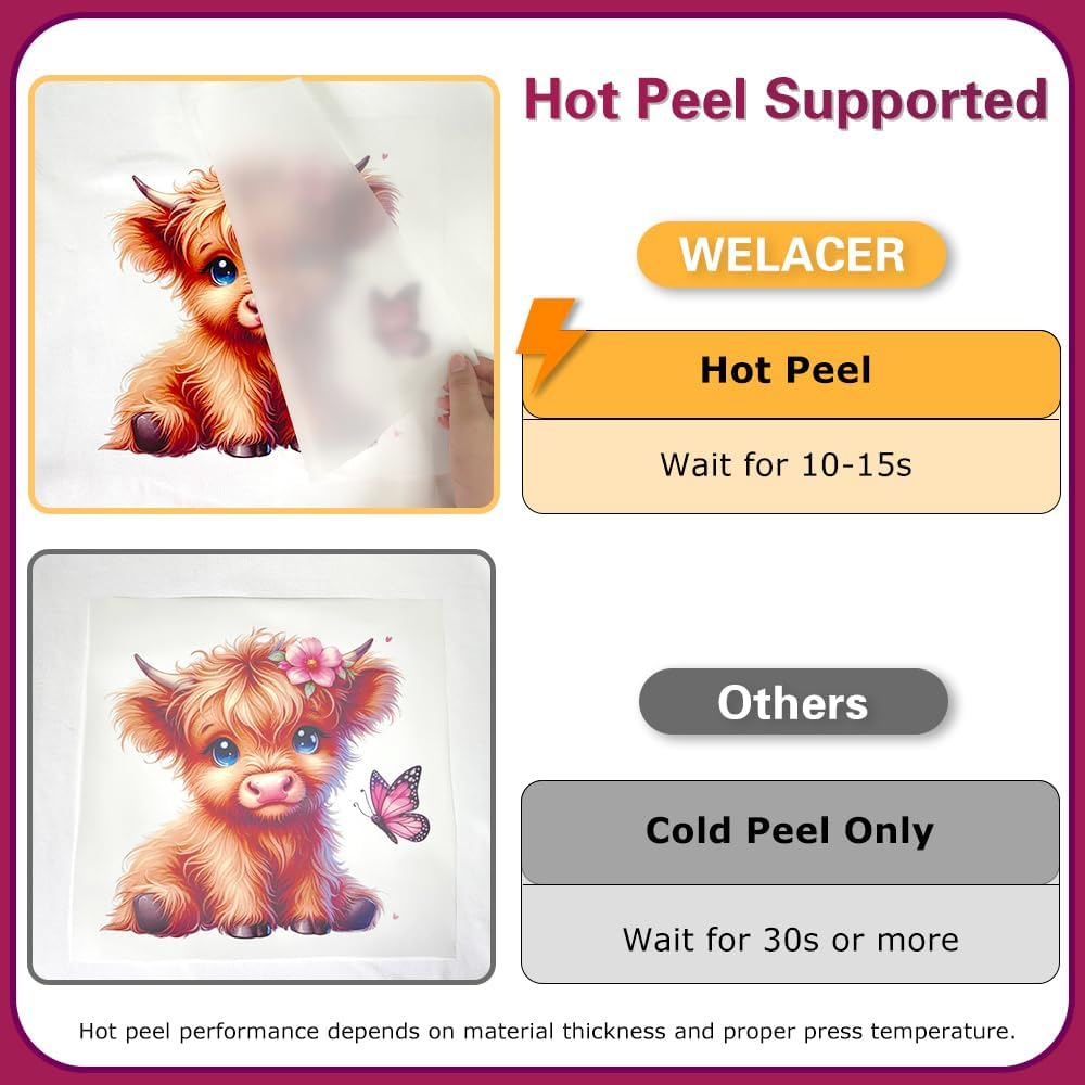 • خيارات التقشير الساخن والبارد. التقشير الساخن خلال 10-15 ثانية لسير عمل أسرع، أو التقشير البارد بعد التبريد الكامل للحصول على مظهر نقل أكثر استقرارًا واتساقًا.