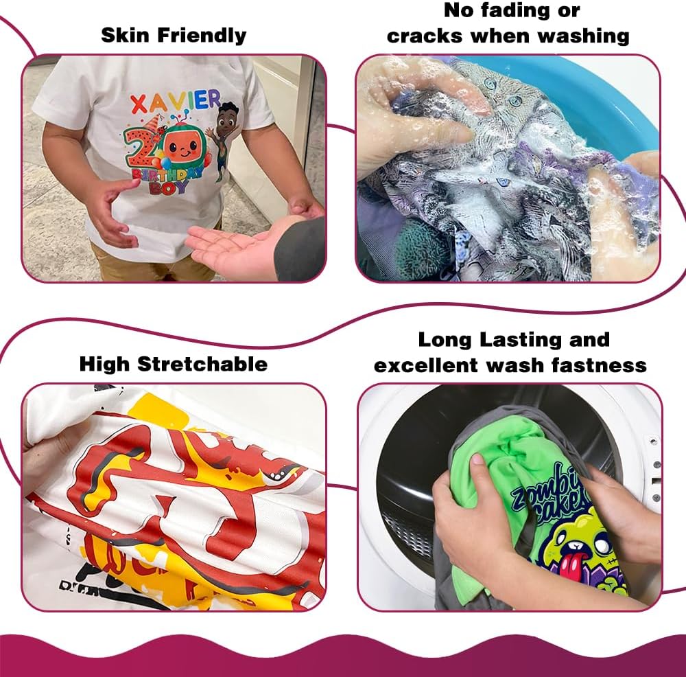 • عمليات نقل متينة وتوافق مع القماش. مُصمم لعمليات النقل المتينة التي تتحمل الغسيل والتمدد عند تطبيقه بشكل صحيح، ومناسب للملابس الخفيفة والداكنة عبر القطن والبوليستر والأقمشة المخلوطة.