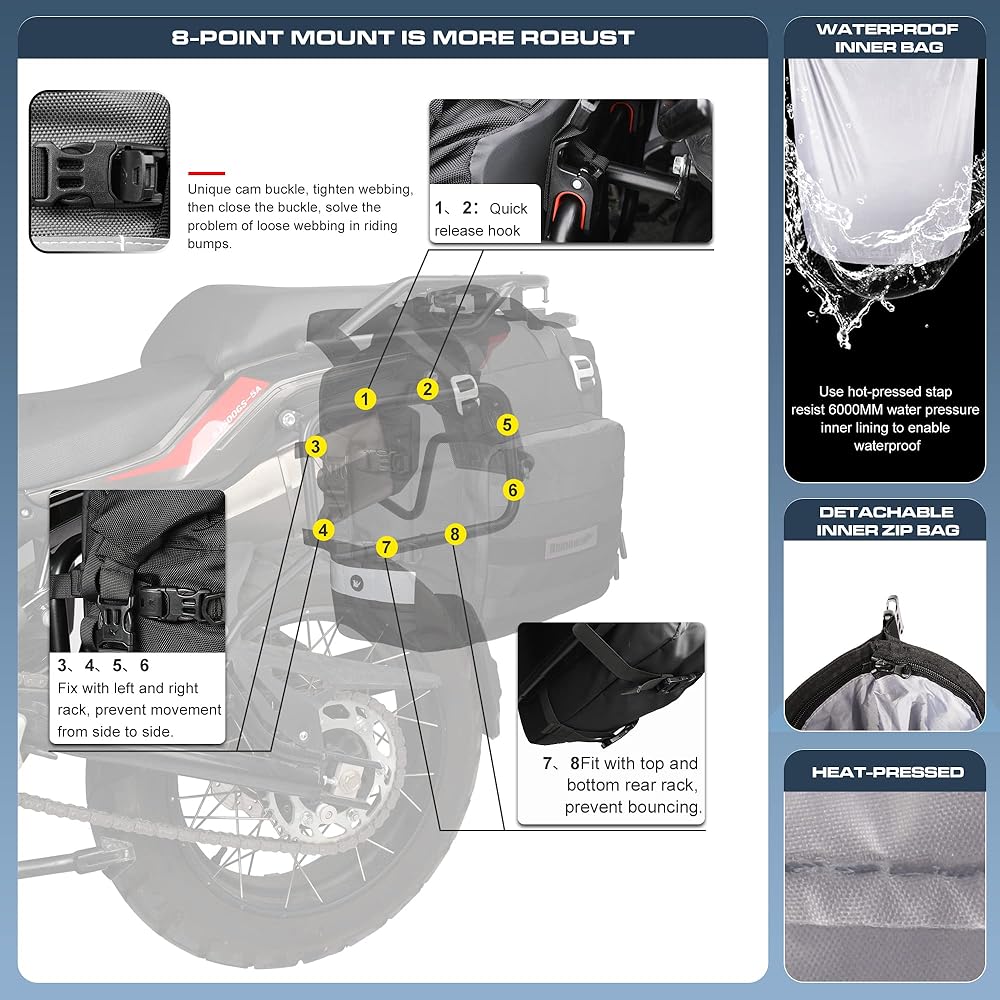 تصميم سريع الفك بدون أدوات: قم بتركيب أو إزالة حقيبة السرج في ثوانٍ باستخدام أبازيم شديدة التحمل سريعة الفك. يتكيف التخزين المدمج بسعة 20 لترًا مع التنقلات اليومية أو المغامرات التي تستغرق عدة أيام