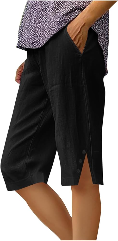 Step into summer comfort with these versatile knee-length Bermuda shorts designed specifically for women. Crafted from breathable linen fabric, these shorts offer the perfect blend of style and casual comfort. The elastic waisted design ensures a comfortable, adjustable fit while the side split with decorative buttons adds a distinctive fashion detail. These shorts hit right at the knee for a flattering length that works well for various occasions - from casual outings to relaxed weekend activities. Available in multiple colors, these shorts feature practical side pockets and a relaxed silhouette that pairs beautifully with any summer top. The lightweight linen material keeps you cool and comfortable even on warm days, while the classic design ensures these shorts will become a wardrobe staple. Perfect for vacation wear, beach days, or everyday casual style, these shorts offer both functionality and fashion appeal. The quality construction and thoughtful design details make these shorts a versatile addition to any summer wardrobe.