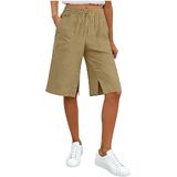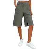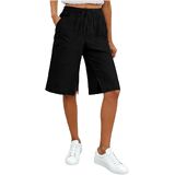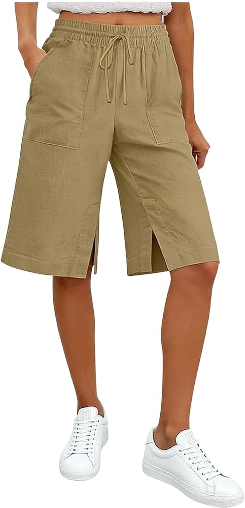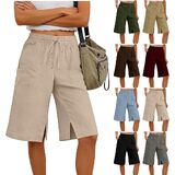 Step into summer comfort with these versatile women's Bermuda shorts. Made from breathable linen-blend fabric, these casual shorts feature a relaxed fit and convenient side pockets perfect for carrying small essentials. The elastic waistband with adjustable drawstring ensures a customizable, comfortable fit for all-day wear. Stylish side slits add a modern touch while enhancing mobility. Available in multiple sophisticated colors including khaki, olive, black, and navy, these knee-length shorts are ideal for beach outings, casual weekends, or vacation wear. The loose-fitting design keeps you cool and comfortable in warm weather while maintaining a polished look. Pair these shorts with your favorite tops for an effortlessly chic summer ensemble. The durable construction and practical design make these shorts a must-have addition to your warm-weather wardrobe.