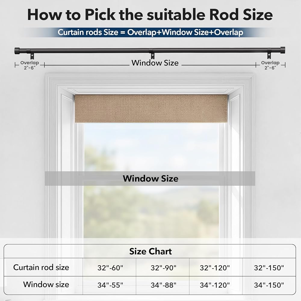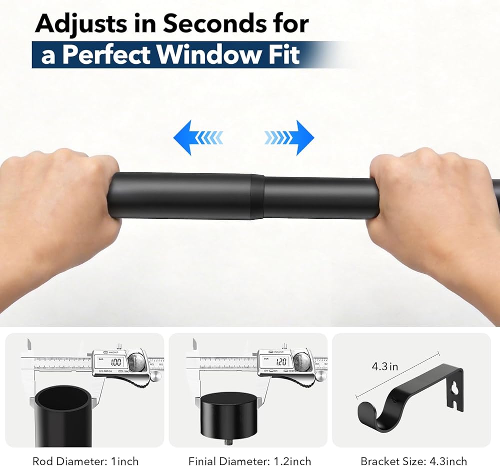 • طول قابل للتعديل، ملاءمة مثالية: تصميم تلسكوبي قابل للتعديل بسهولة مع خيارات مقاسات متعددة يضمن ملاءمة مثالية للنوافذ بجميع عروضها. استخدم دليل "اختيار مقاس قضيب الستارة" الخاص بنا للعثور على مقاسك المثالي.