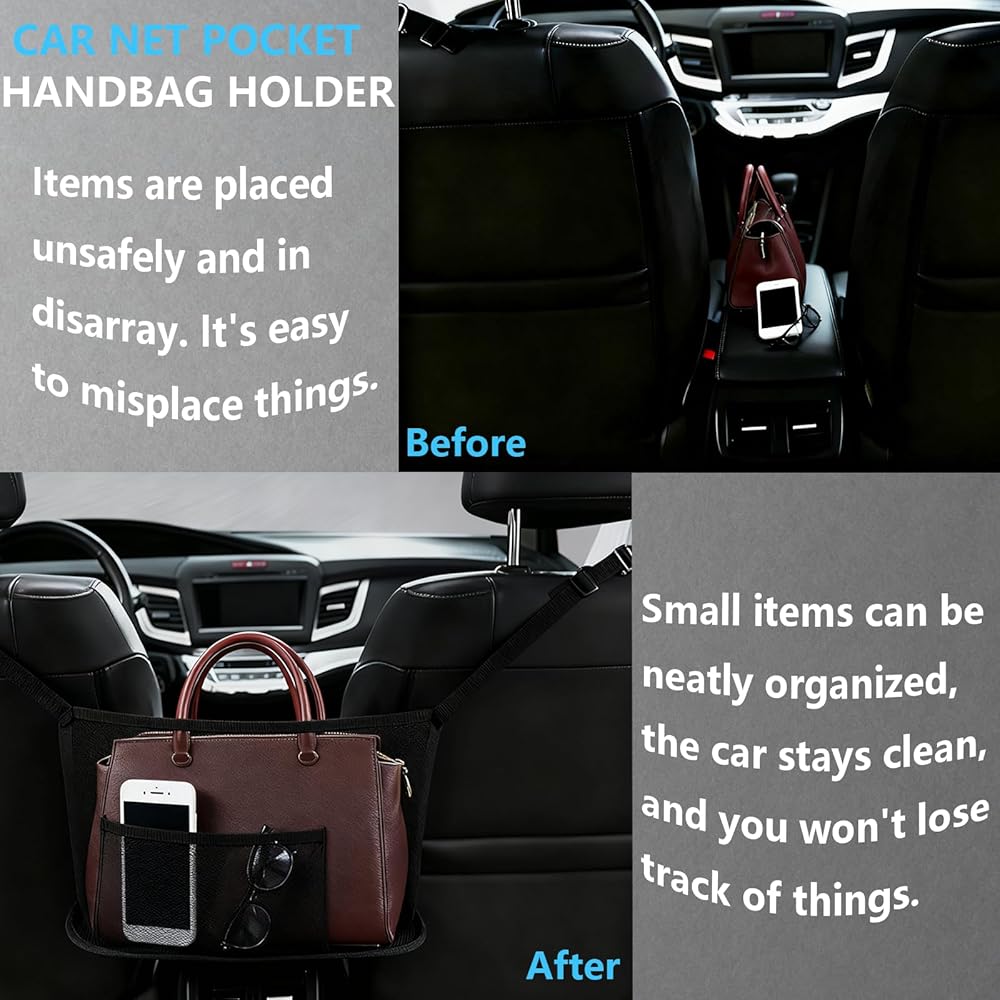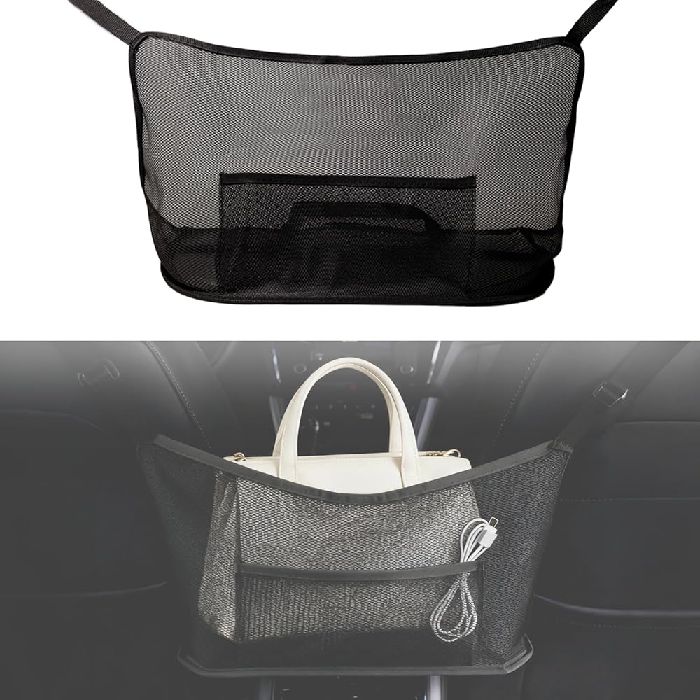 حامل محفظة للسيارة بين المقعد الأمامي، حامل حقيبة يد شبكي للجيب وحاجز للمقعد الخلفي للحيوانات الأليفة/الأطفال، منظم حقيبة شبكية لتخزين الهواتف/الوجبات الخفيفة، ملحقات السيارة للنساء