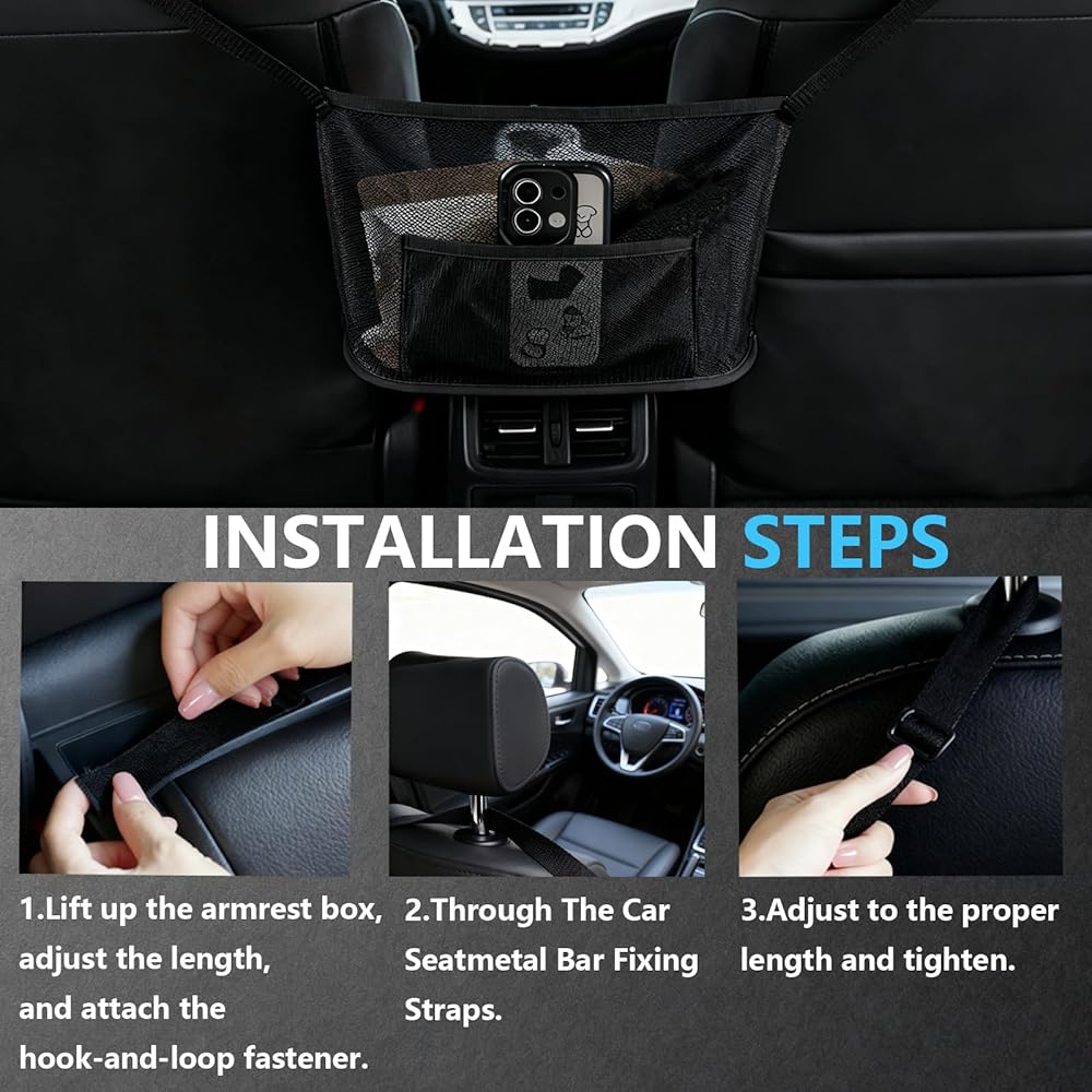 • تركيب خالٍ من الأدوات لمدة دقيقة واحدة (بدون ضجة) لا يتطلب أدوات معقدة! قم بالتركيب في 3 خطوات بسيطة: قم بتركيبه بمسند الذراع المركزي عبر خطاف وحلقة قوية، ثم قم بربط الأشرطة من خلال القضبان المعدنية للمقعد الأمامي، ثم قم بشدها - انتهي. كما أنه من السهل إزالته وإعادة تركيبه عند تبديل السيارات، مما يوفر وقتك.