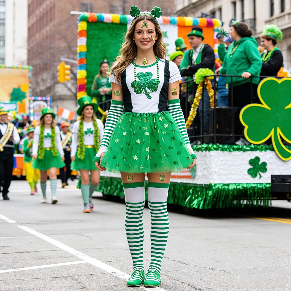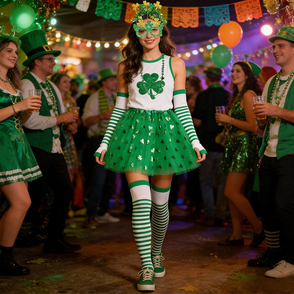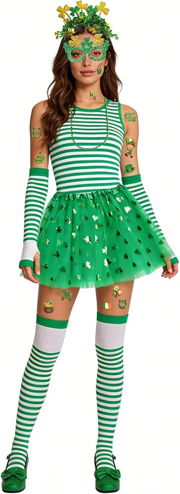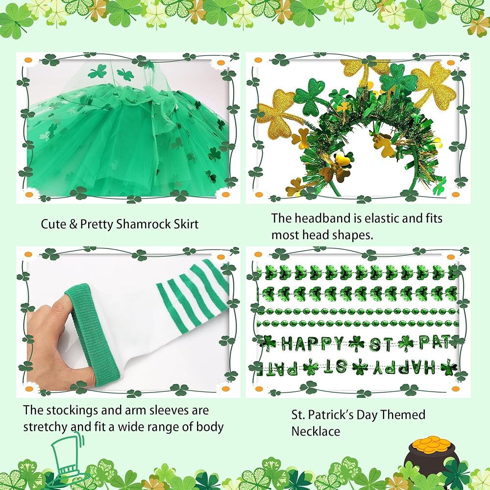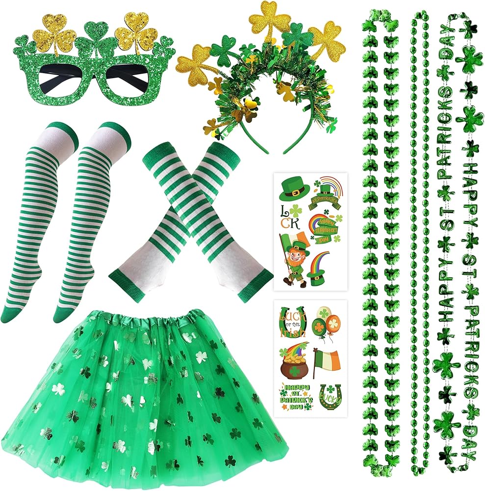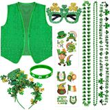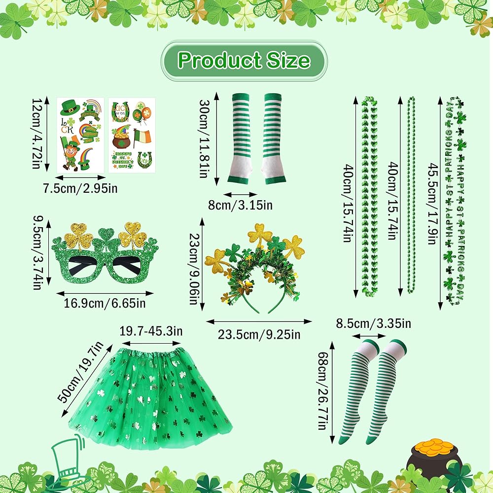 مجموعة أزياء عيد القديس باتريك الكاملة: تتضمن هذه المجموعة الاحتفالية عصابة رأس واحدة، وزوجًا من نظارات النفل، وسترة واحدة من الترتر الأخضر، و1 سوار معصم من نبات النفل، و2 ورقة من الوشم المؤقت، و3 قلادات عيد القديس باتريك، كل ما تحتاجه لخلق مظهر أيرلندي ممتع لاحتفالات عيد القديس باتريك.