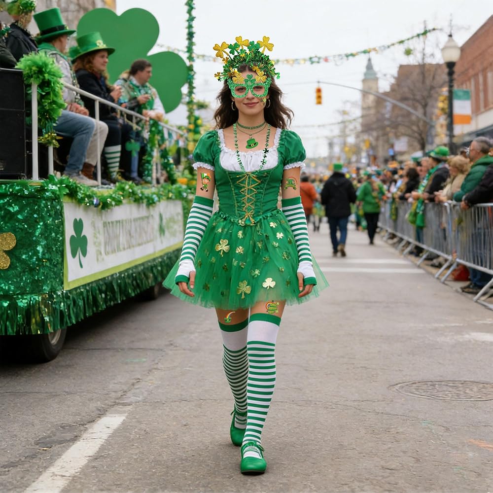 مواد متينة ومريحة: السترة ذات الترتر الأخضر مصنوعة من نسيج البوليستر مع ترتر بلاستيكي مرفق، وتتميز ببطانة ناعمة لراحة طوال اليوم. تستخدم عصابة الرأس والنظارات البلاستيكية القوية ومواد اللباد للاستخدام المتكرر. سوار المعصم مصنوع من السيليكون المرن. القلائد الأيرلندية مصنوعة من البلاستيك القوي، والوشم المؤقت سهل الاستخدام.