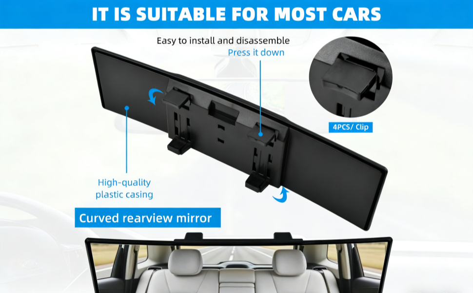 • استخدام واسع: حجم مرآة الرؤية الخلفية هو النوع الأول: 27 × 6.5 سم، النوع الثاني: 30 × 7 سم، أطول من معظم مرآة الرؤية الخلفية، مما يعني أنها يمكن أن توفر لك مجال رؤية أوسع من غيرها وتصميم مشبك السيارة يناسب المركبات العالمية، مثل السيارة وسيارات الدفع الرباعي وCRV والشاحنات والشاحنات.