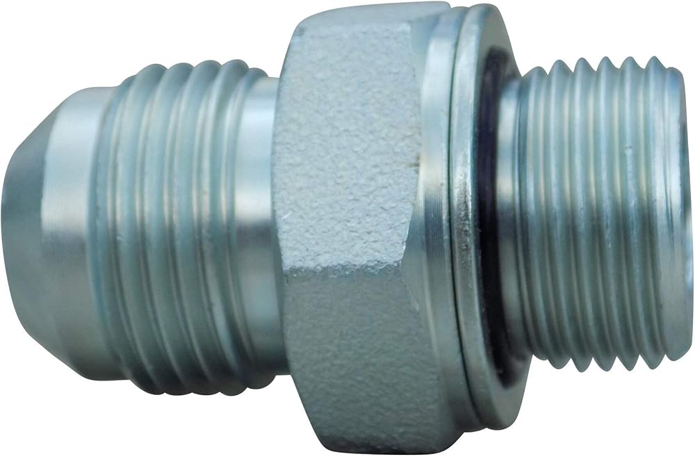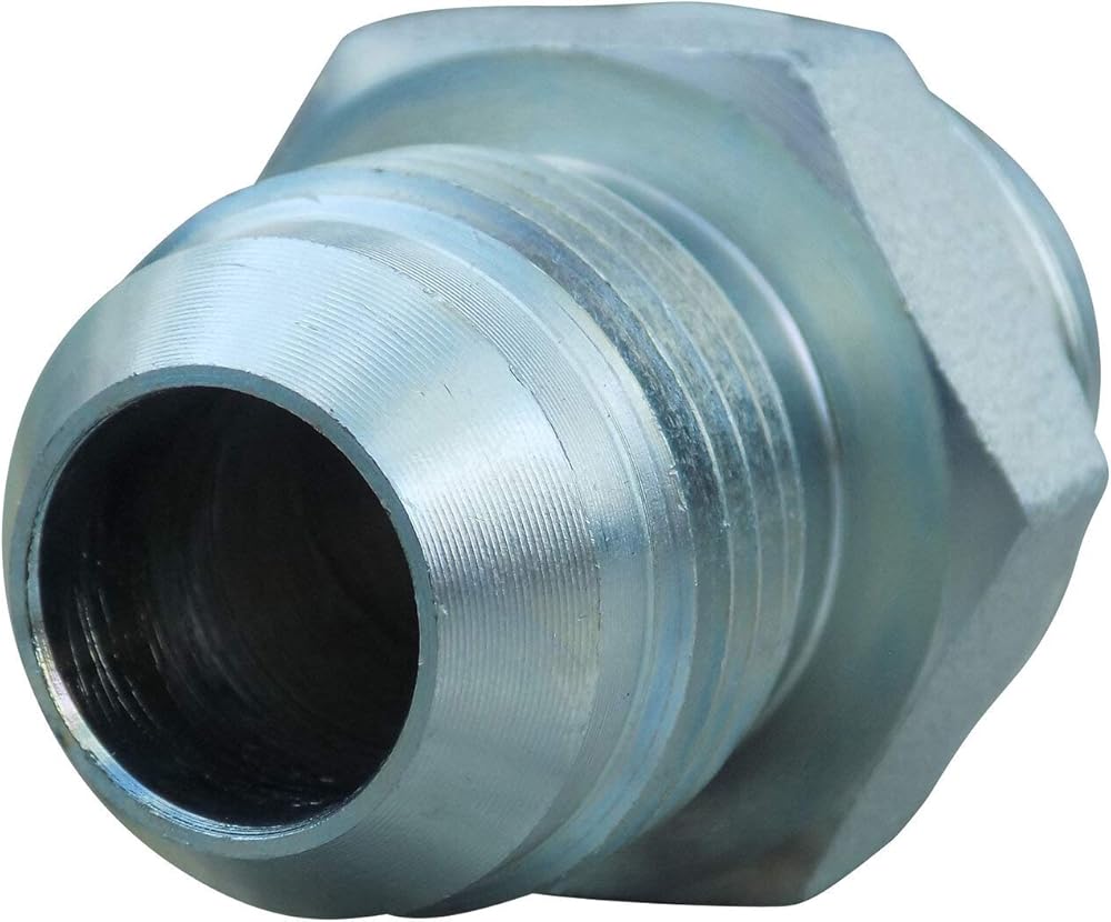 The 22mm side threads into the radiator and the standard JIC fitting side connects to our transmission cooler lines.