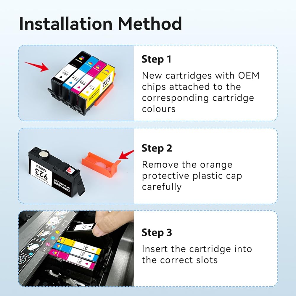 جديد لا رقائق: يتطلب رقائق. خراطيش حبر الطابعة الخاصة بنا غير مجهزة بالرقائق، وتحتاج إلى إعداد الرقائق وتثبيتها لتشغيلها. تشتمل خراطيش الحبر الخاصة بنا على أداة إزالة الرقائق، وهي سهلة التركيب للرقاقة لحزمة التحرير والسرد المكونة من خراطيش الحبر 923 باللون الأسود والألوان.