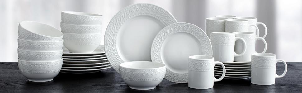 This 16-piece dinnerware set, service for four, includes (4) each: 10-1/2 inch dinner plate, 8 inch salad plate, 5-1/2 inch (17 ounce) soup cereal bowl and 14 ounce mug