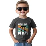 Each shirt showcases a unique and cheerful design from our special collection. Your child might receive a tee featuring the π symbol alongside fun graphics like a friendly dinosaur, a vibrant rainbow, playful white polka dots, or a bold circular pattern. The witty “Math Is Simple” and “Happy Pi Day” text adds an extra layer of humor, making this more than just a math shirt—it's a conversation starter.
