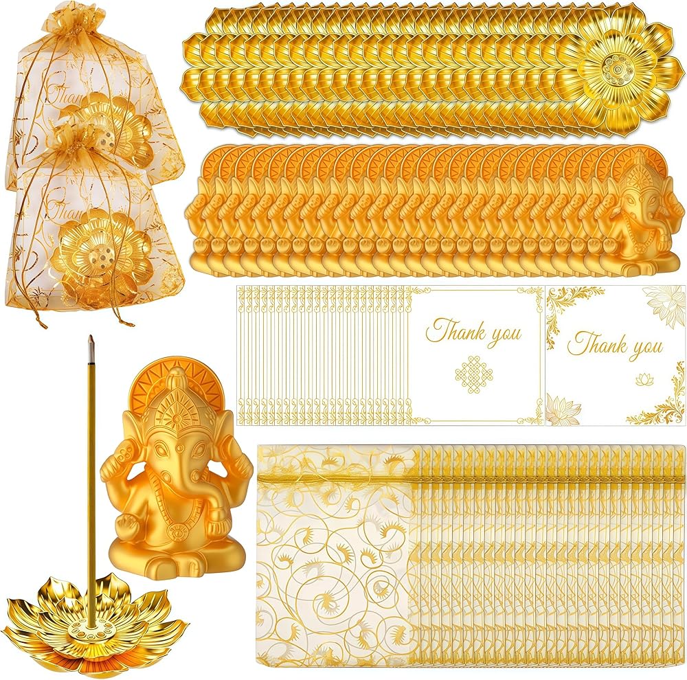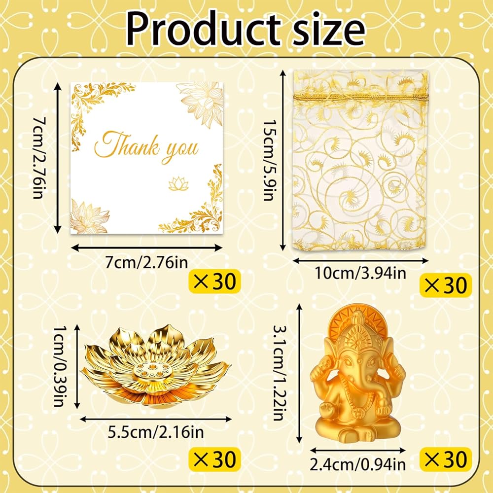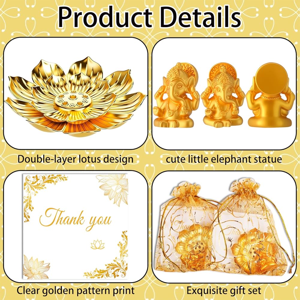 120 Pack Diwali Gifts Bulk with 30 Lotus Incense Holders, 30 Mini Golden Ganesha Ornaments, Organza Bags & Thank You Cards – Indian Return Gifts for Pooja, Festivals & Celebrations (Golden Set)