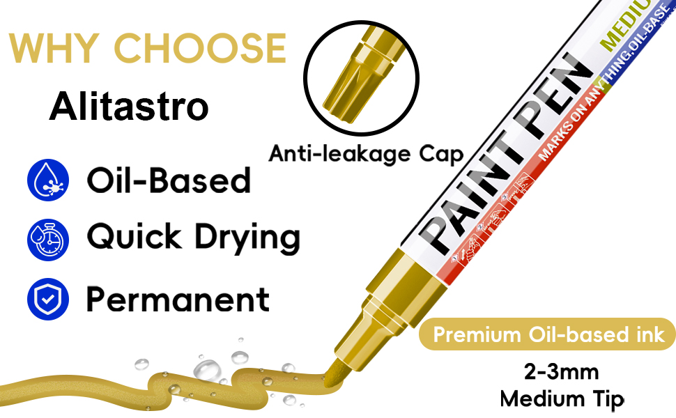 【استخدام متعدد الاستخدامات】يشير قلم التحديد الدائم الذهبي هذا إلى الفولاذ والأسطح المعدنية الأخرى مثل الإطارات والمسامير والأنابيب المعدنية والألواح الممتصة للصدمات وما إلى ذلك. ليس المعدن فقط، قلم الطلاء الذهبي Alitastro مثالي للزجاج والخشب والمطاط والحجر والبلاستيك والورق والقماش والمزيد. يضمن هذا الطلاء الخارجي بقاء علامتك واضحة وسليمة مع مرور الوقت. لماذا لا تحصل على واحدة لنفسك؟