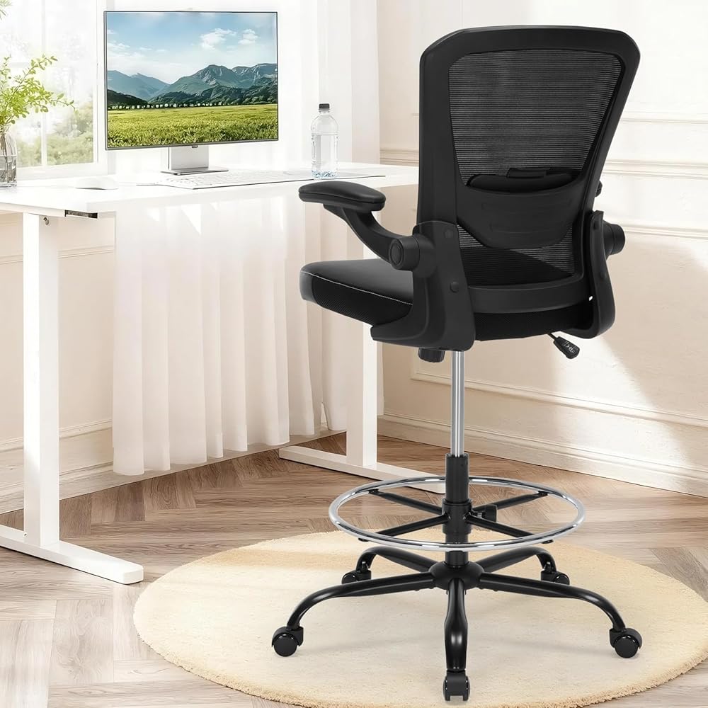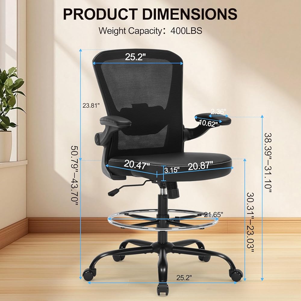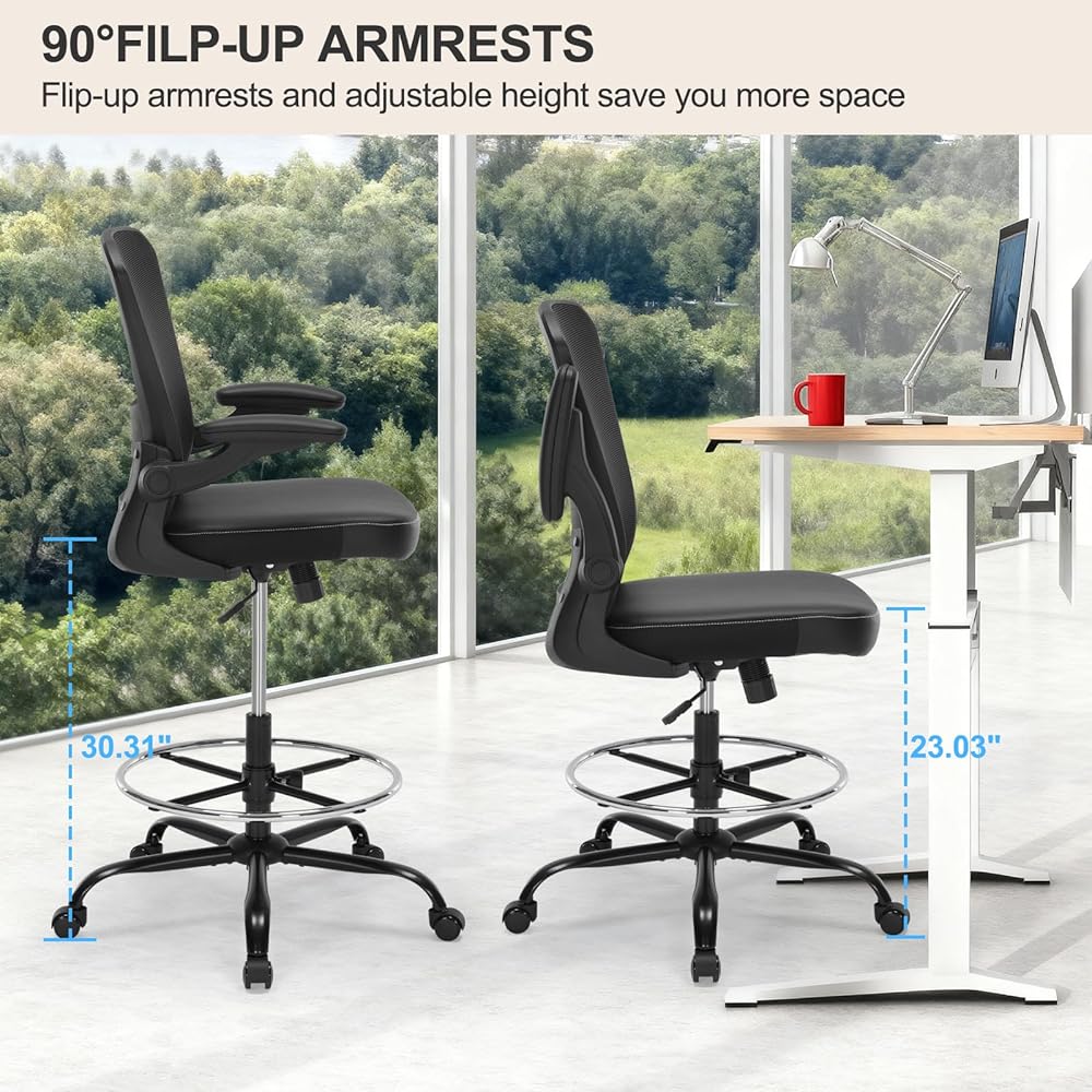 【كرسي رسم قابل للتعديل】مصمم للمكاتب الدائمة وطاولات الرسم، ويمكن تعديل ارتفاع المقعد من 23 بوصة إلى 30 بوصة ليتناسب مع احتياجات محطة العمل المختلفة. توفر حلقة القدم إمكانية تعديل الارتفاع بمقدار 4 بوصات لدعم الساق المستقر، بينما توفر مساند الذراعين القابلة للطي بزاوية 90 درجة راحة الذراع عند الحاجة وتسمح بدفع مقعد المكتب بسهولة تحت المكتب لتوفير المساحة.