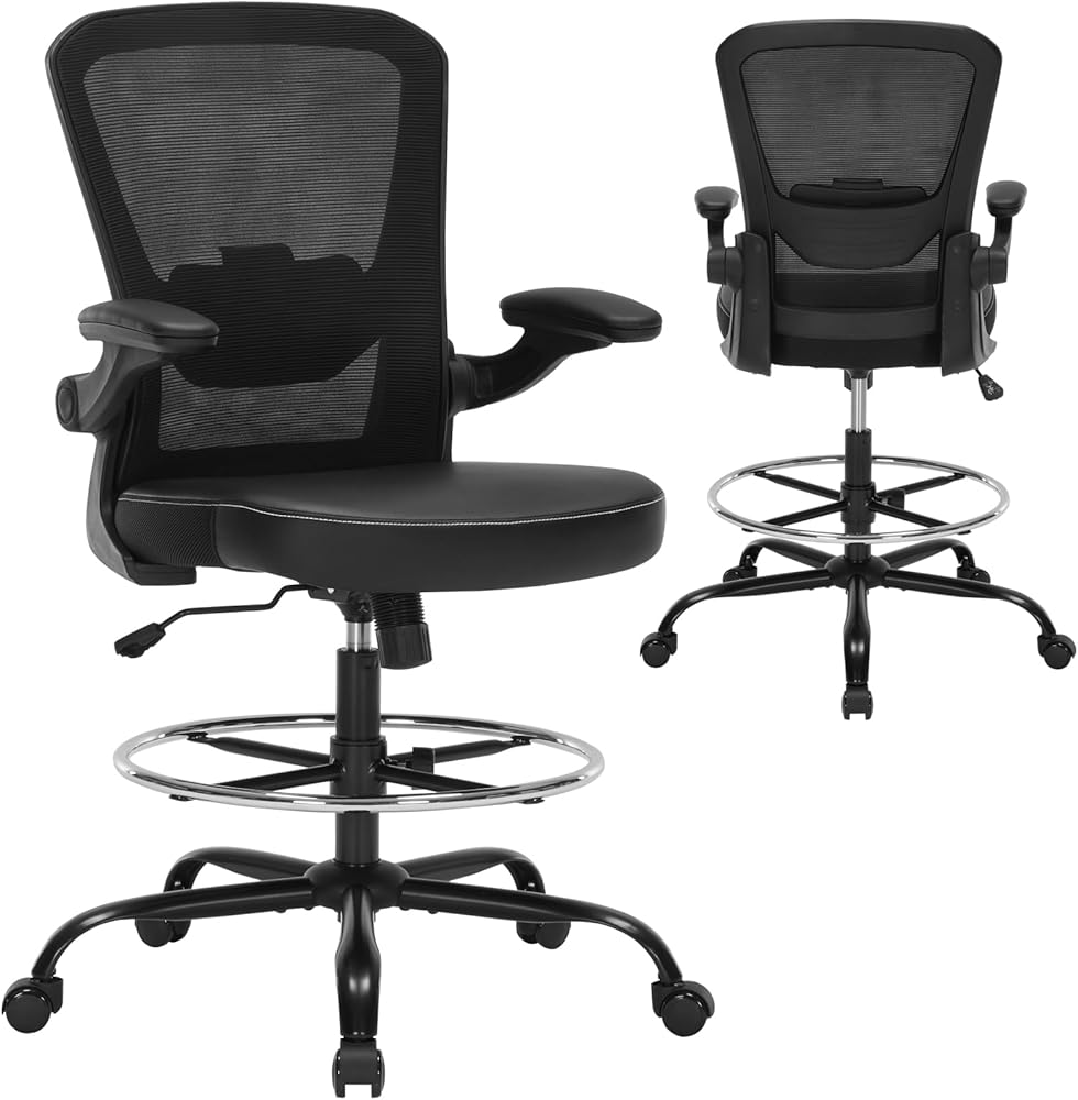 كرسي مكتب طويل مع مقعد من جلد البولي يوريثان، كرسي مكتب مريح بوزن 400 رطل مع دعم قطني، مقعد مضاد مع حلقة مسند للقدمين قابلة للتعديل ومساند للذراعين قابلة للطي، أسود