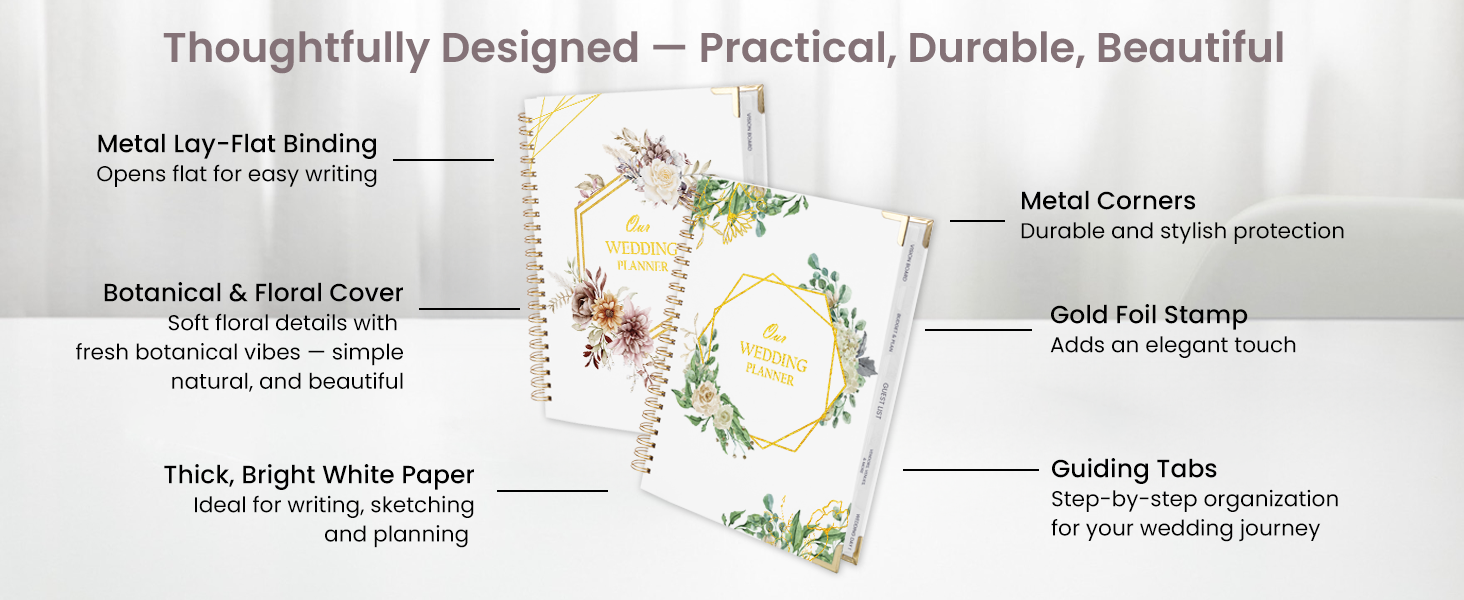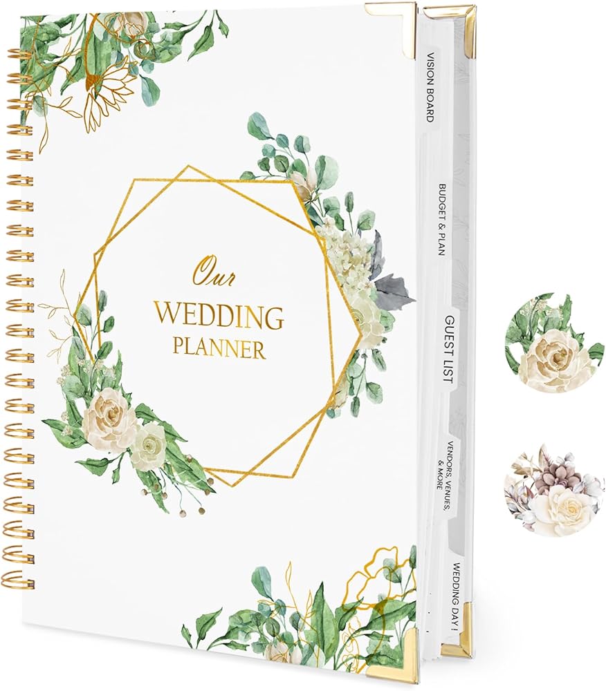الميزات: الحجم 9 × 12 بوصة، أكثر من 130 صفحة. يشتمل مخطط الزفاف المفصل هذا على زوايا معدنية، وتجليد حلزوني ذهبي مسطح، و5 علامات تبويب إرشادية، و5 جيوب، وعد تنازلي لمدة 18 شهرًا، وقائمة مرجعية.
