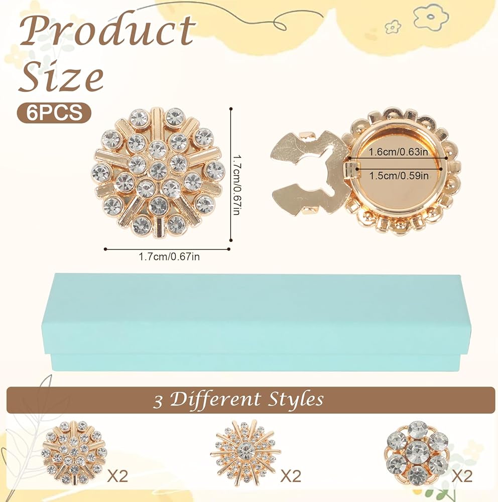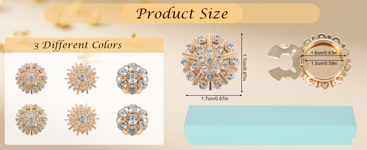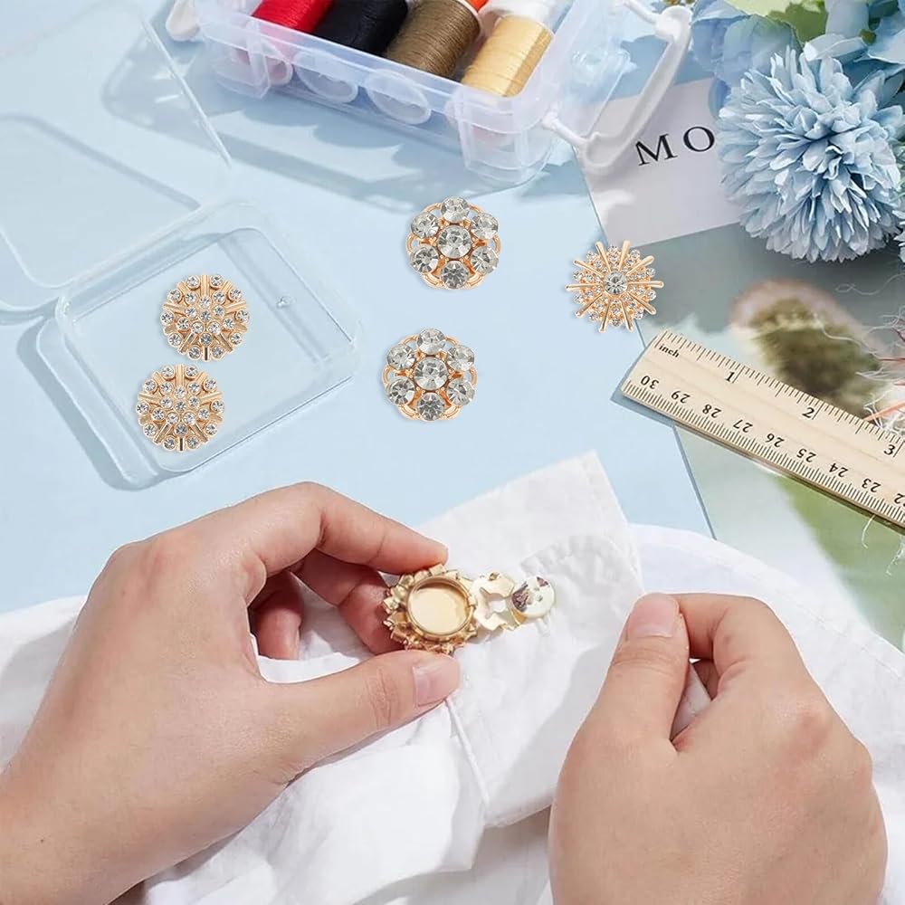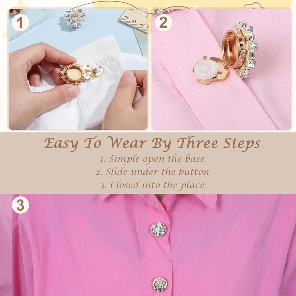 سريع الارتداء: ببساطة افتح الجزء السفلي من غطاء الزر المصنوع من حجر الراين، ثم قم بتركيبه على الزر وأغلقه، وتستغرق العملية بأكملها بضع ثوانٍ فقط.