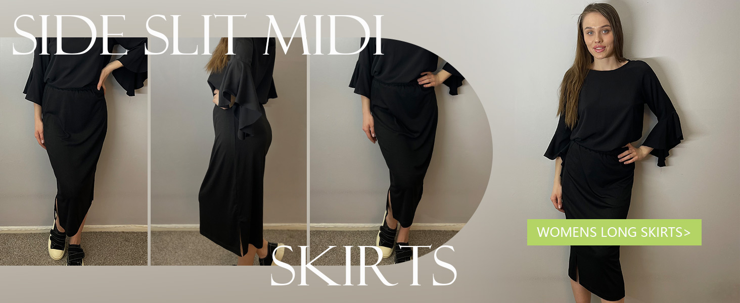 Features: midi length, two side slit, elastic waist, high waisted, solid, no pockets, no linning, casual style.