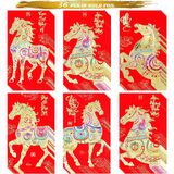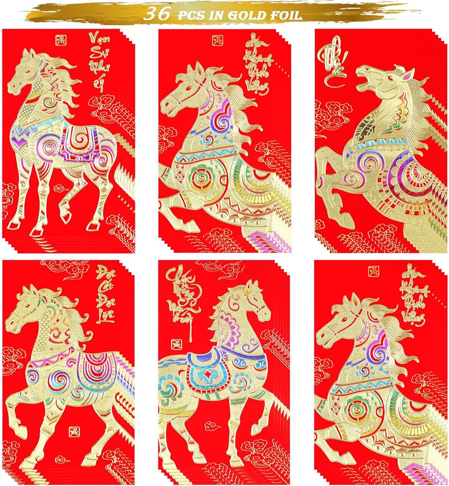 BLESSING: Vietnamese Lunar New Year red envelopes are a timeless tradition symbolizing good fortune and prosperity, The horse are richly decorated with dense traditional patterns (spirals, stripes, cloud motifs), with Ornate detail and cultural symbolism. Each red envelope comes with a message of blessing, allowing you to convey good wishes to your family and friends.