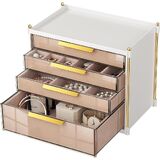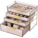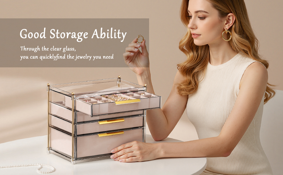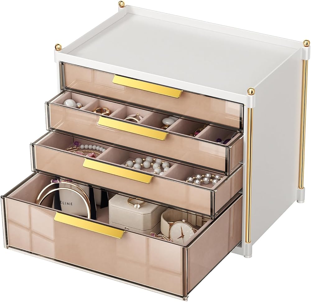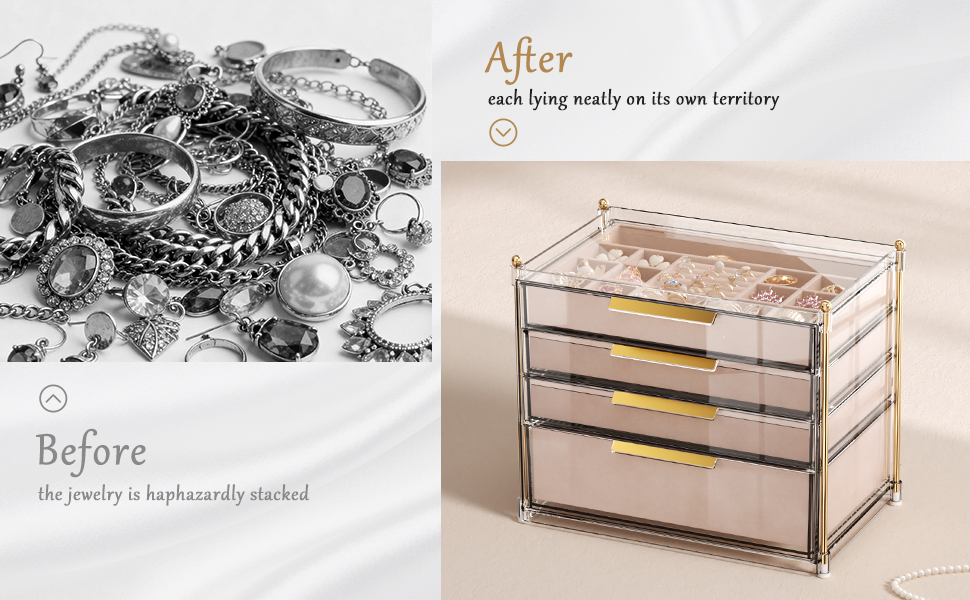 【تصميم تنظيم المجوهرات من 4 طبقات】 يتميز منظم المجوهرات هذا ذو الأدراج بطبقة علوية مع مساحات تخزين متعددة مقسمة للقطع الصغيرة مثل الخواتم والأقراط المرصعة والأقراط الحلقية وأساور الأذن ودبابيس الزينة، بينما توفر الأدراج السفلية الواسعة مساحة واسعة للمجوهرات الأكبر مثل القلائد والمعلقات والأساور والساعات وإكسسوارات الشعر والقطع المميزة - مما يحافظ على كل شيء منفصلاً بشكل أنيق وخالي من التشابك وسهل الوصول إليه.