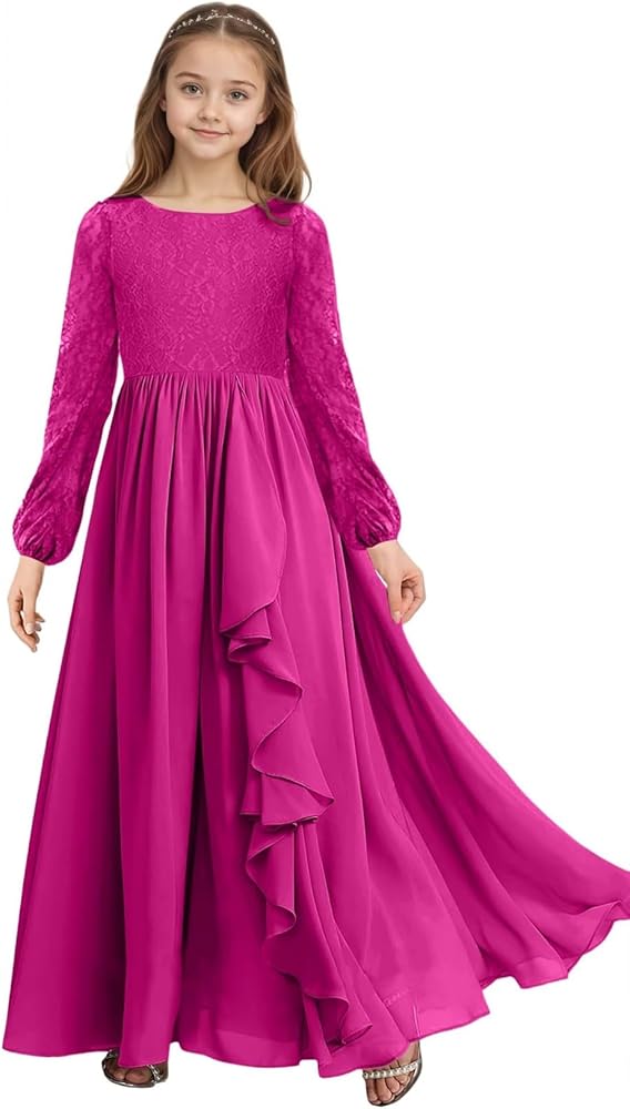 المزايا: فستان وصيفة العروس الصغيرة على شكل حرف A للفتيات المراهقات، فستان فتاة الزهور برقبة عالية، فستان رسمي للفتيات بأكمام طويلة، فستان وصيفة العروس الصغيرة بطول الأرض، شيفون مطوي، أكمام قصيرة، مع دانتيل، مقاس إضافي، مقاس صغير، سحاب خلفي، مبطن بالكامل مما يجعله مريحًا في الارتداء.