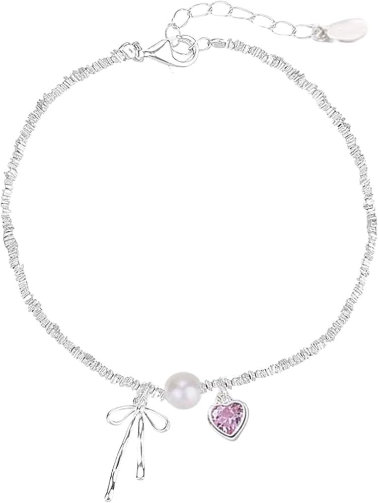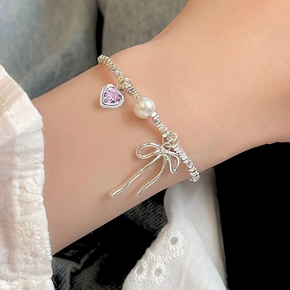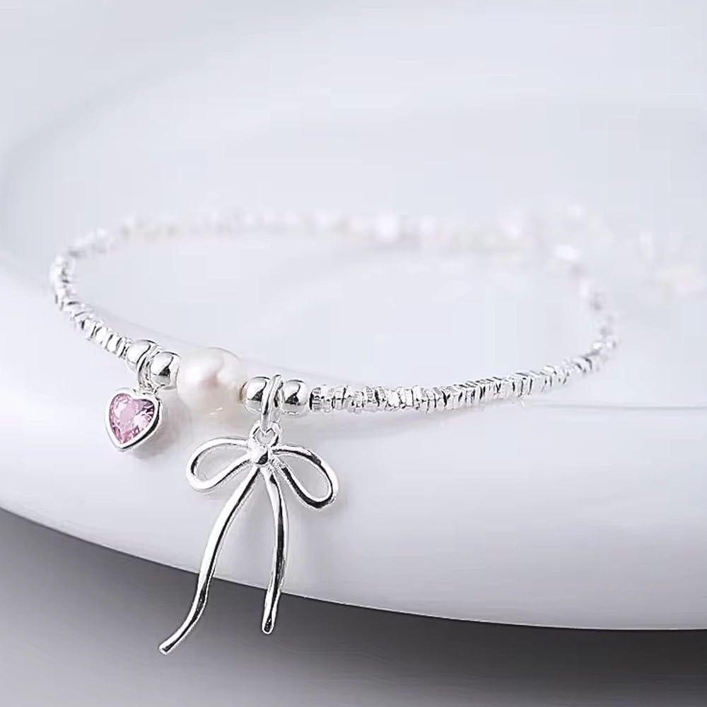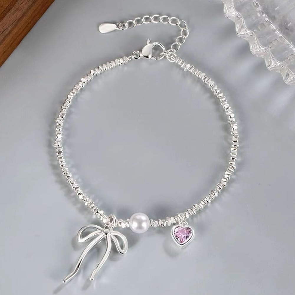 QueenBee 925 Sterling Silver Pink Heart Bow Charm Pearl Bracelet, Elegant Charm Bracelets for Women, Trendy Silver Jewelry Birthday, Valentines Day, Wedding, Bridal, Mother's Day Gift for Her